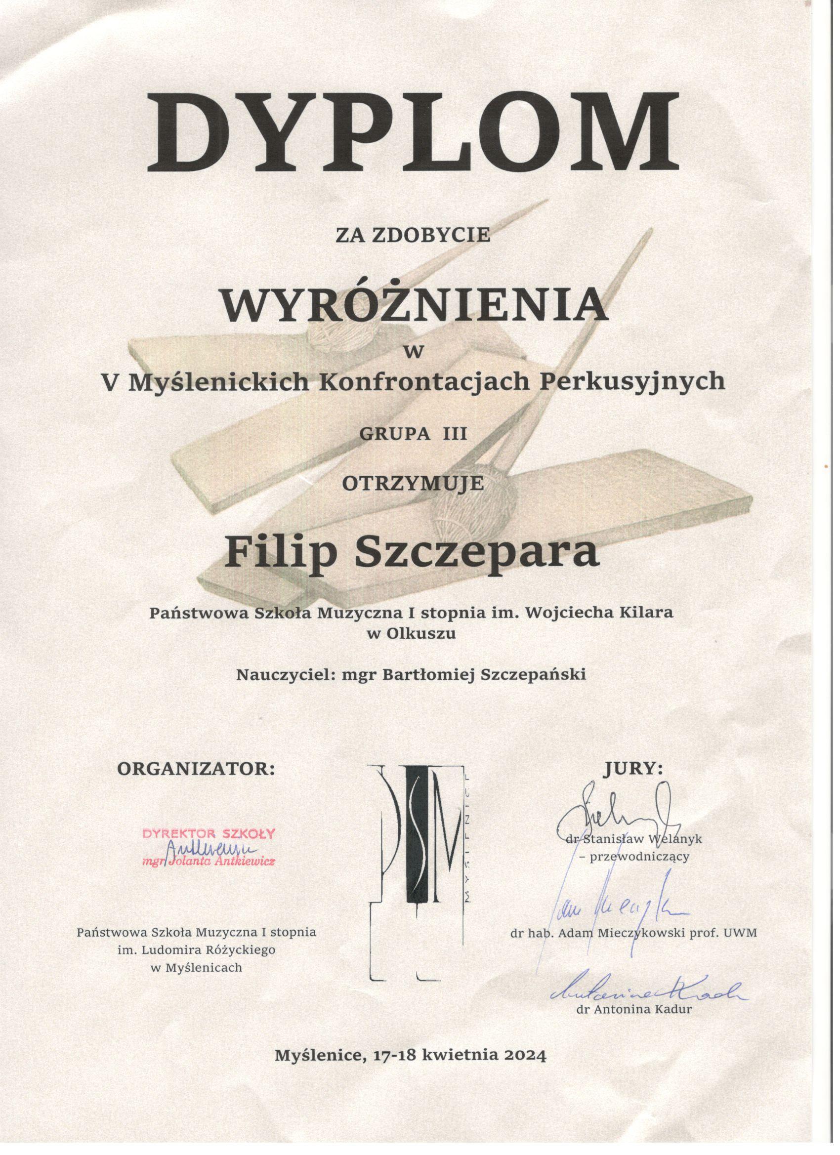 V Myślenickie Konfrontacje Perkusyjne - Filip Szczepara - wyróżnienie w grupie III z klasy perkusji mgr Bartłomieja Szczepańskiego