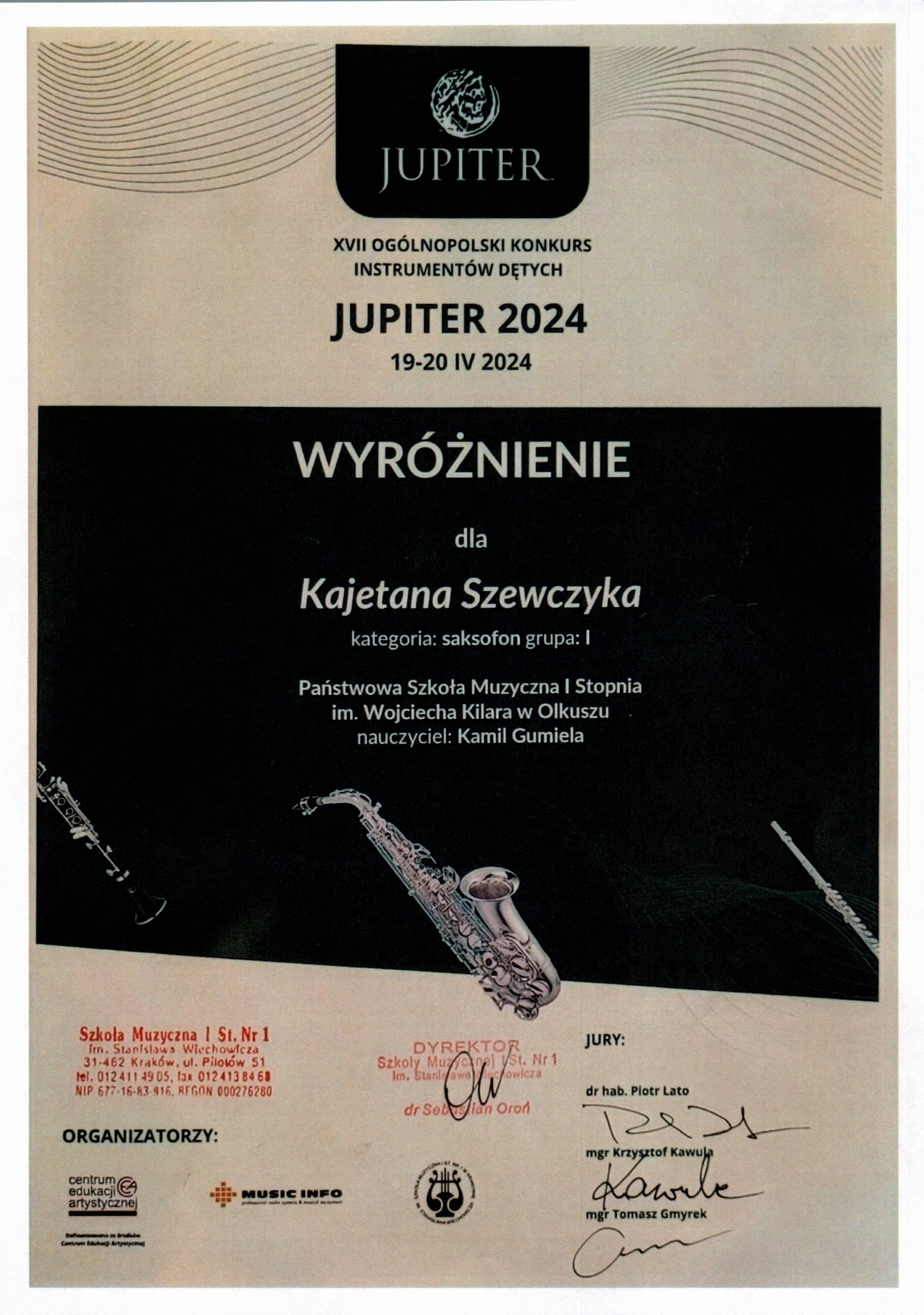 XVII Ogólnopolski Konkurs Instrumentów Dętych - Jupiter 2024 w Krakowie - Kajetan Szewczyk - wyróznienie w grupie I z klasy saksofonu mgr Kamila Gumieli
