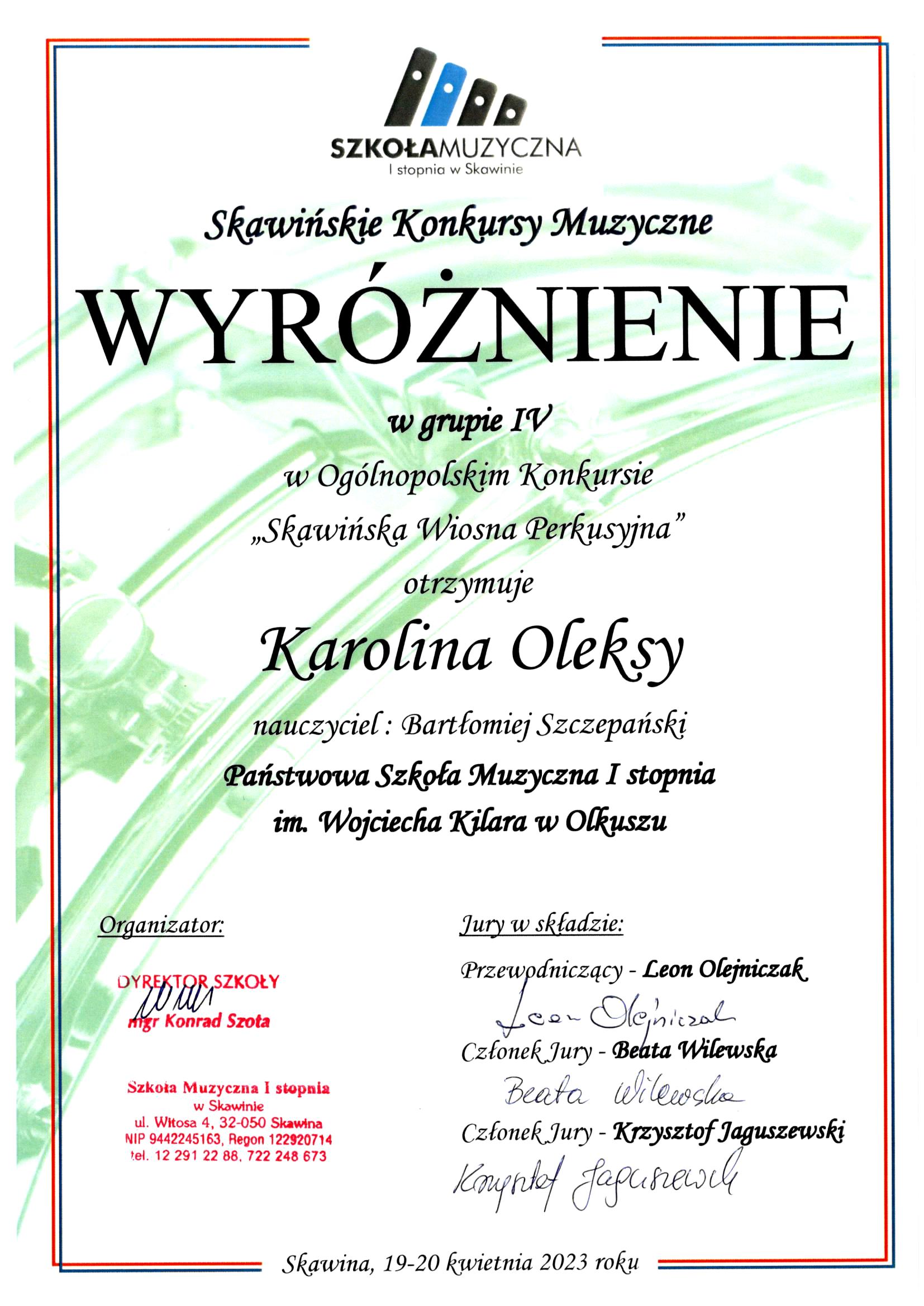 Karolina Oleksy oraz Filip Szczepara z klasy perkusji mgr Bartłomieja Szczepańskiego wyróżnieni w Ogólnopolskim Konkursie "Skawińska Wiosna Perkusyjna".Gratulujemy!!!