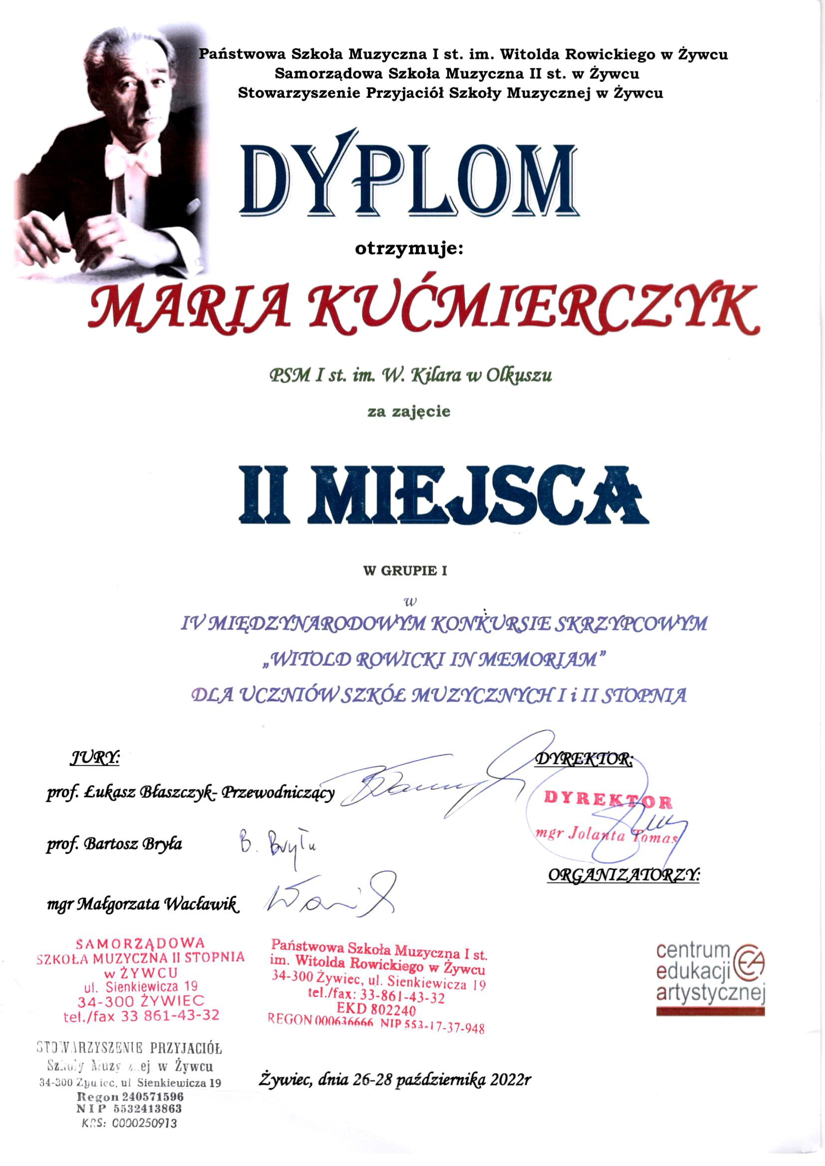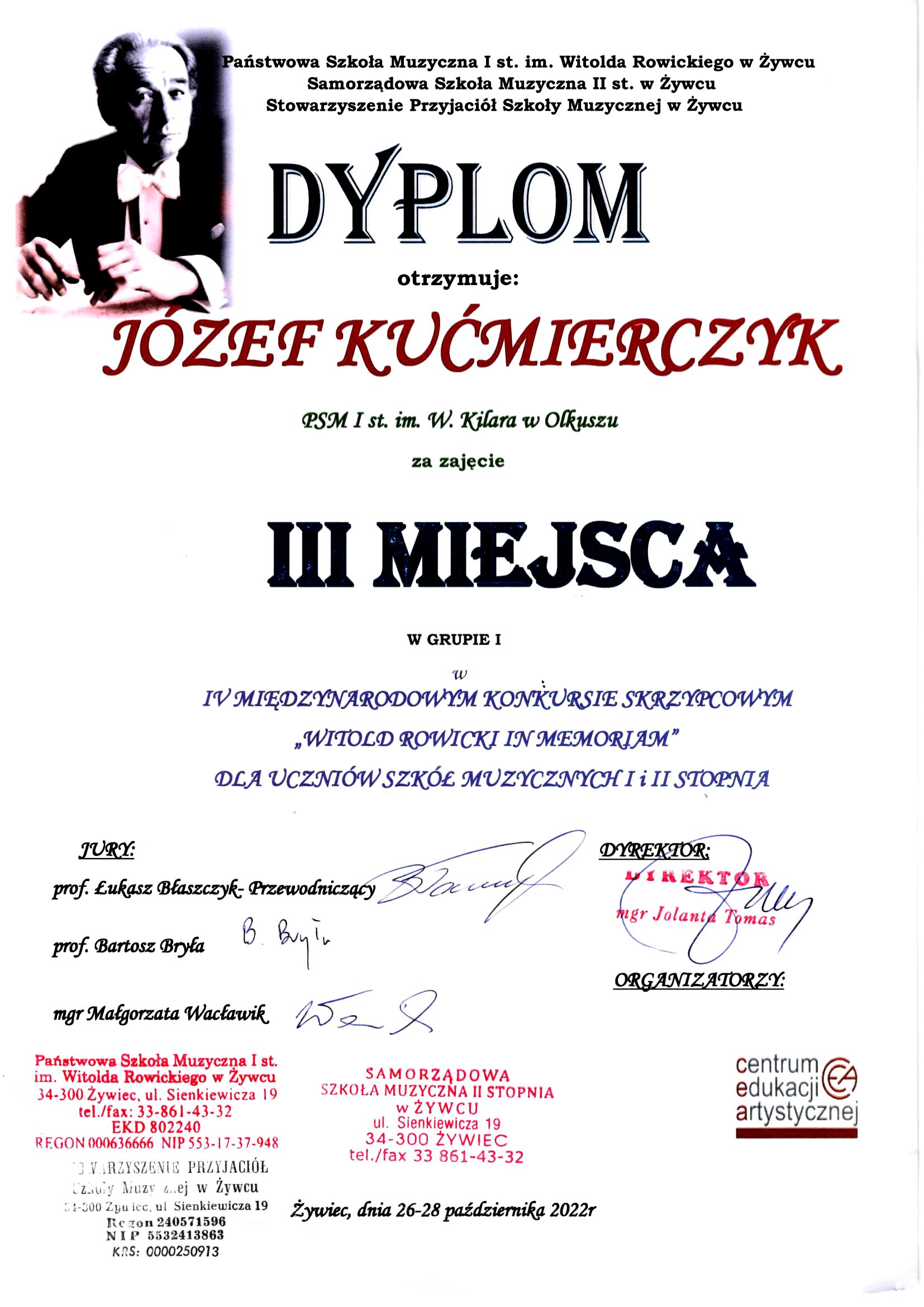 Maria i Józef Kućmierczyk z klasy skrzypiec mgr Jana Kućmierczyka laureatami II i III miejsca na IV Międzynarodowym Konkursie Skrzypcowym "Witold Rowicki In Memoriam" dla uczniów szkół muzycznych I i II stopnia. Gratulujemy!!