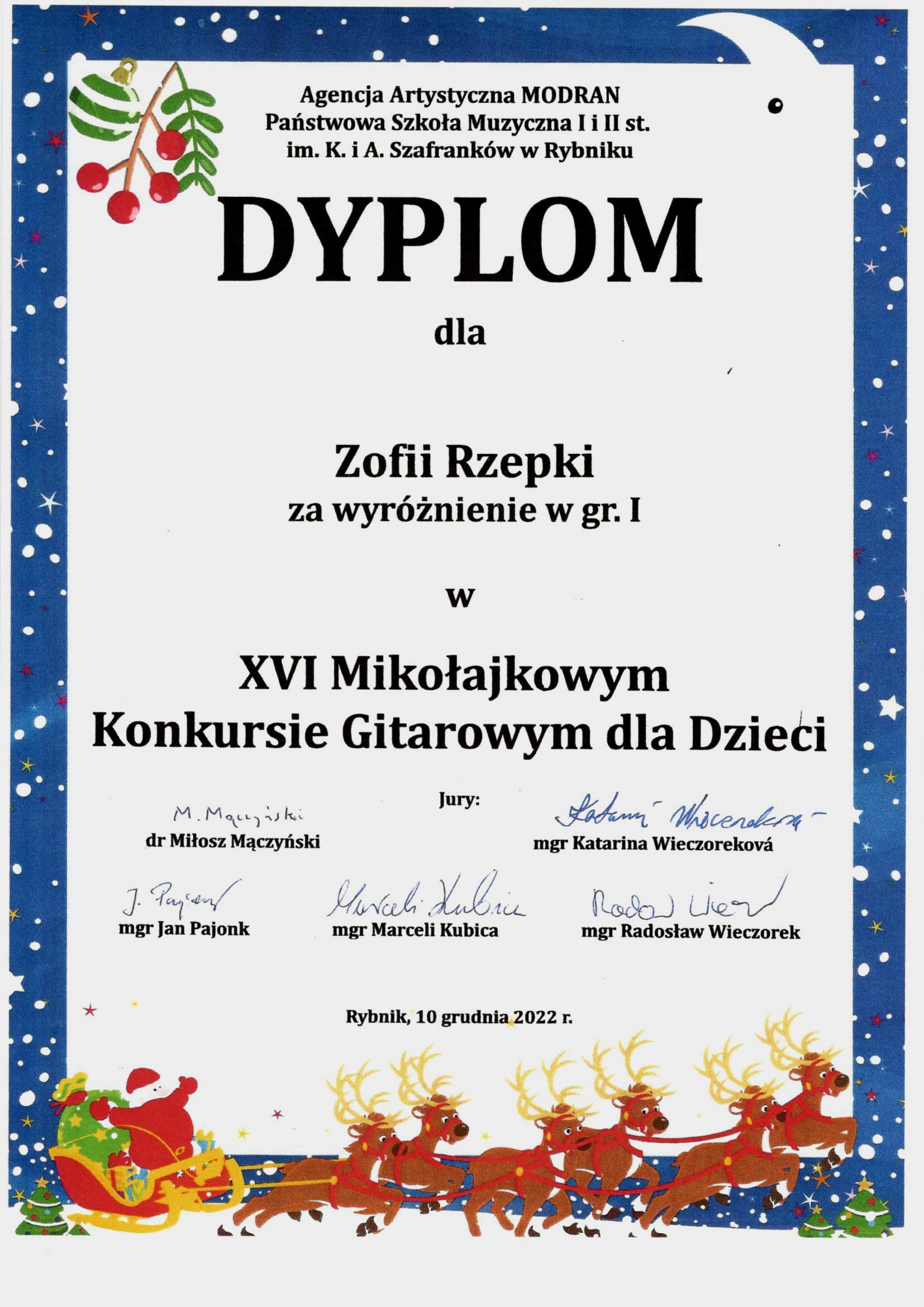 Zofia Rzepka wyróżniona w grupie I w XVI Mikołajkowym Konkursie Gitarowym dla Dzieci w Rybniku. Gratulujemy!!!
