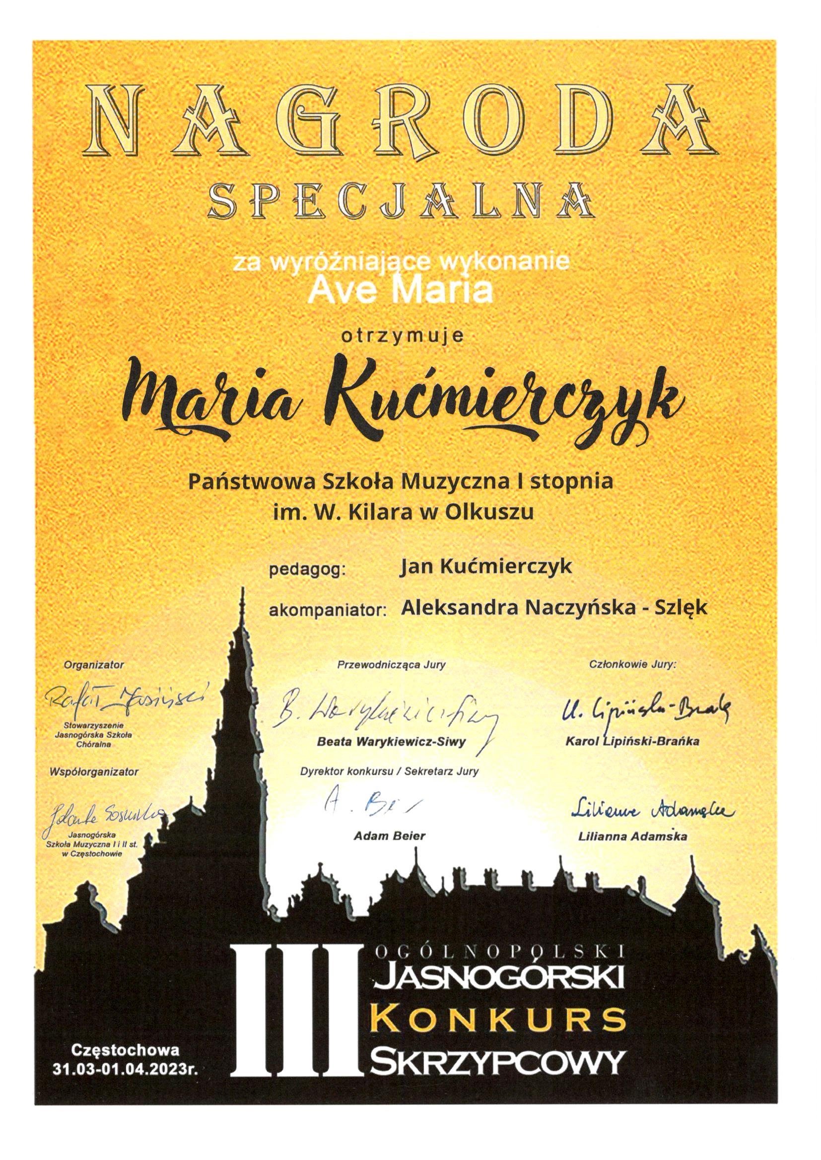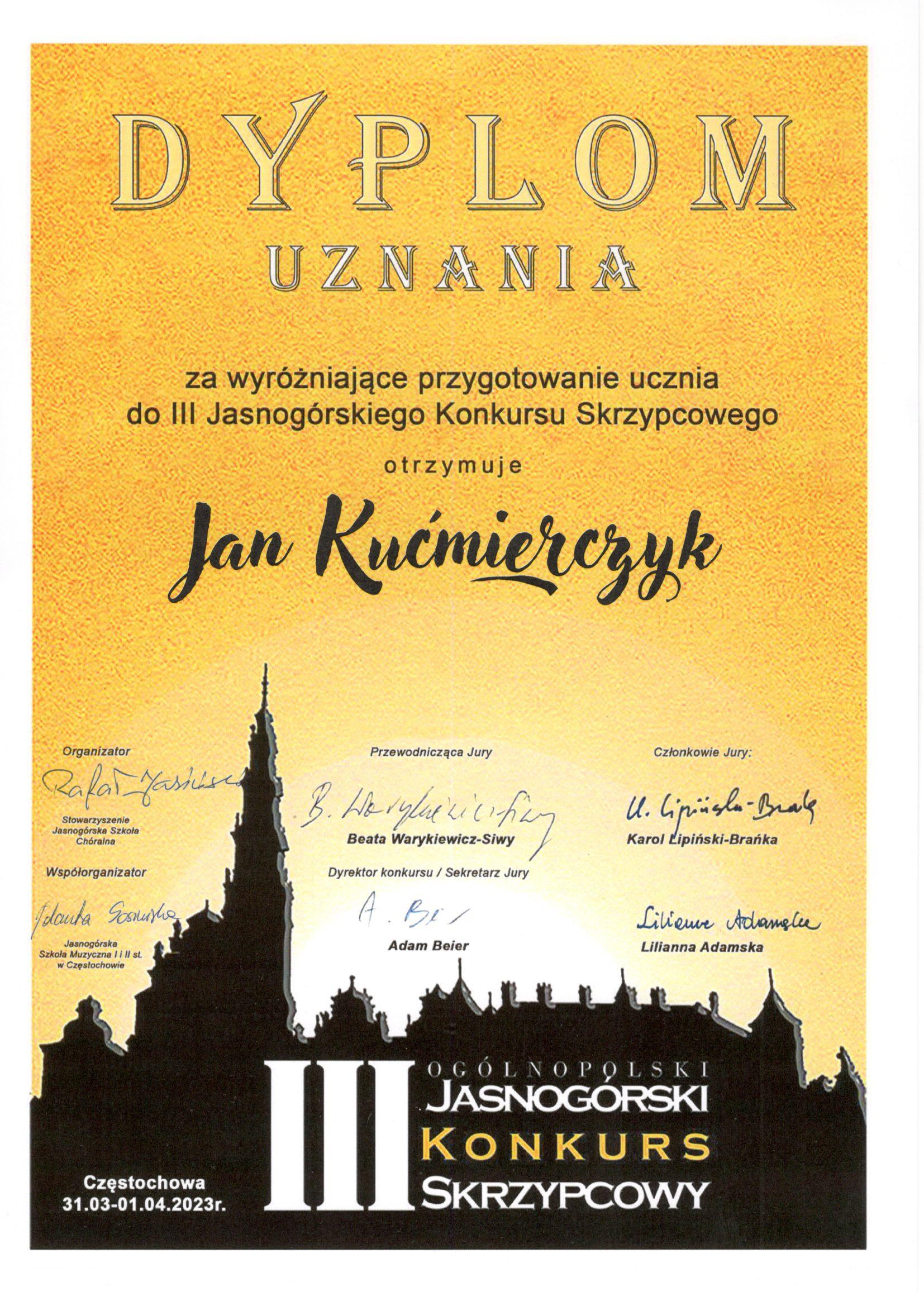 Maria i Józef Kućmierczyk z klasy skrzypiec mgr Jana Kućmierczyka zostali laureatami III Ogólnopolskiego Jasnogórskiego Konkursu Skrzypcowego. Dyplomy uznania dostali również mgr Aleksandra Naczyńska - Szlęk i mgr Jan Kućmierczyk. Gratulujemy!!!