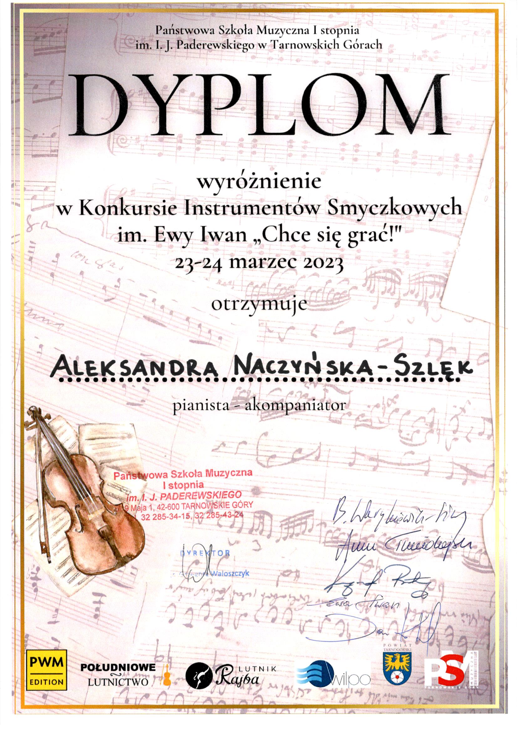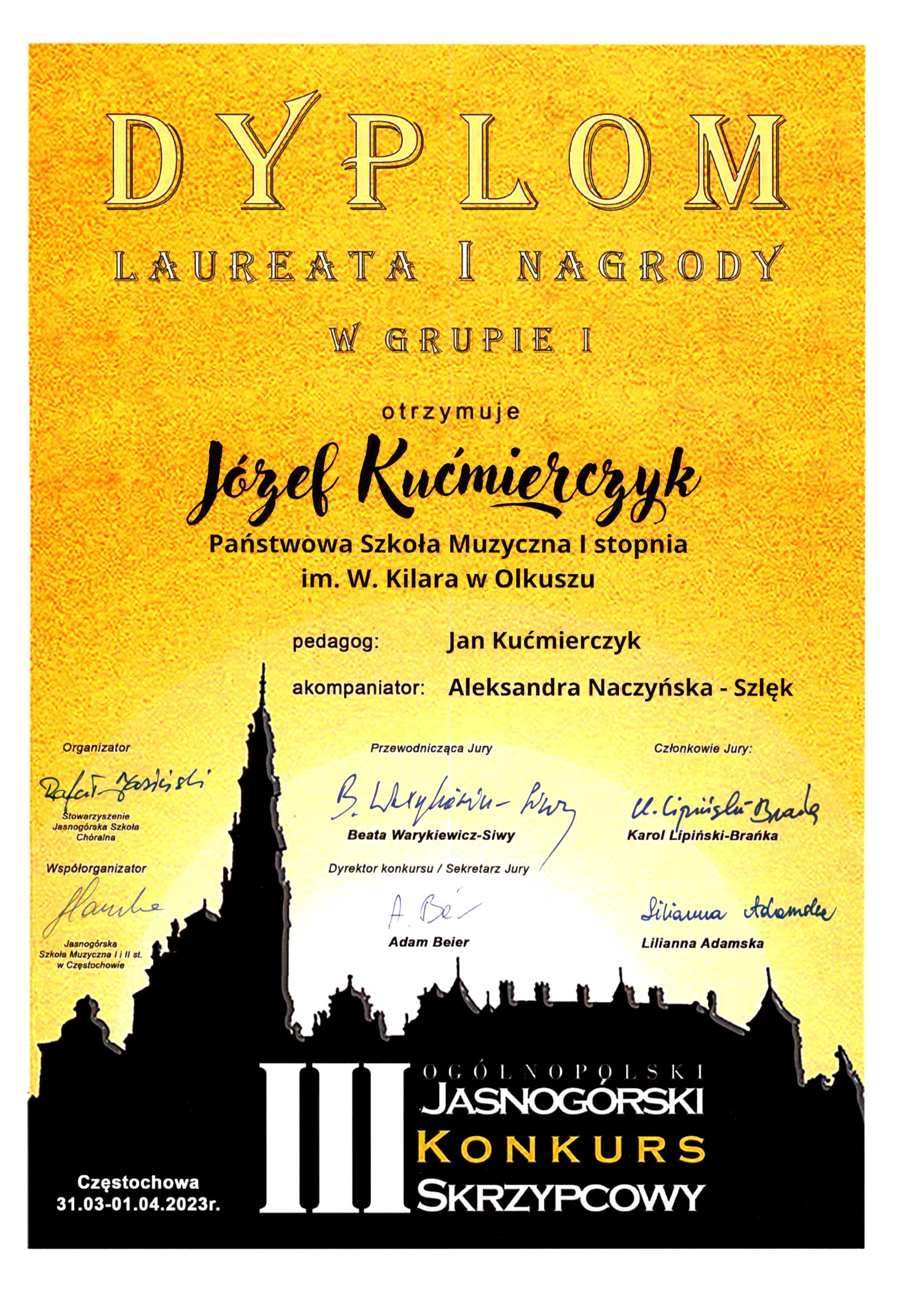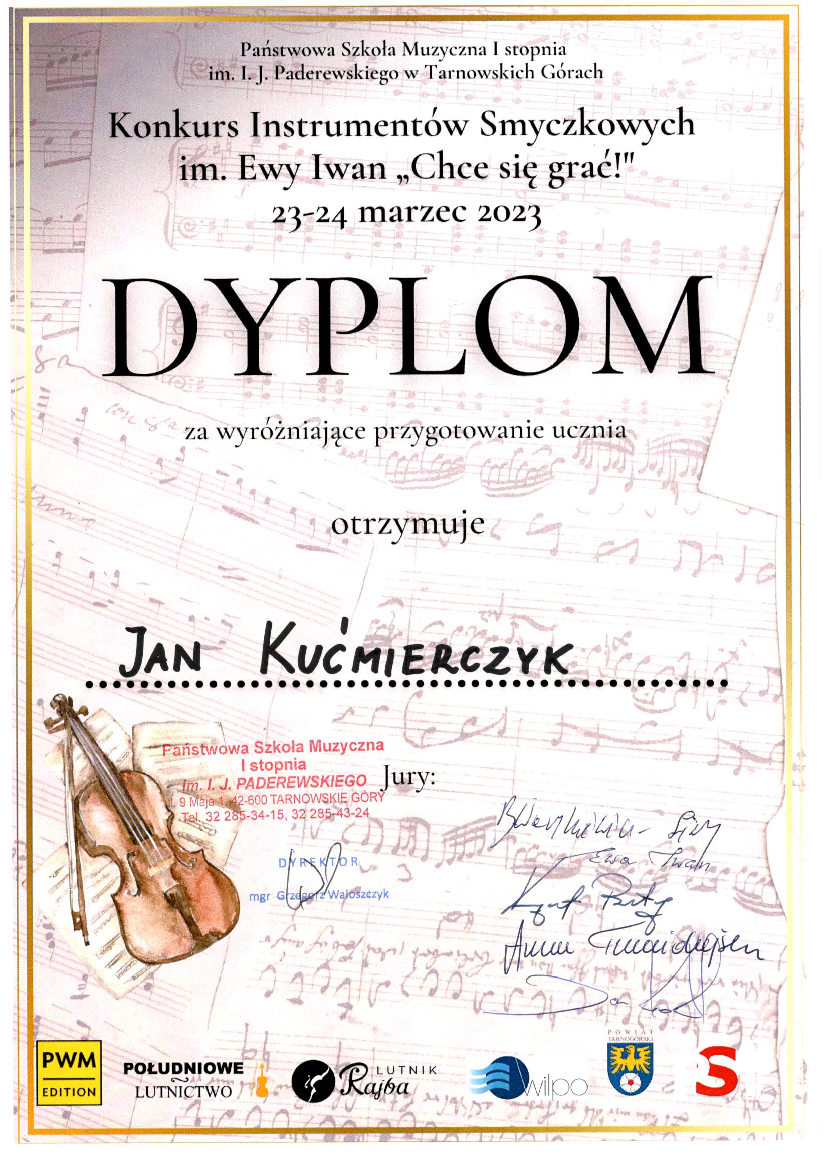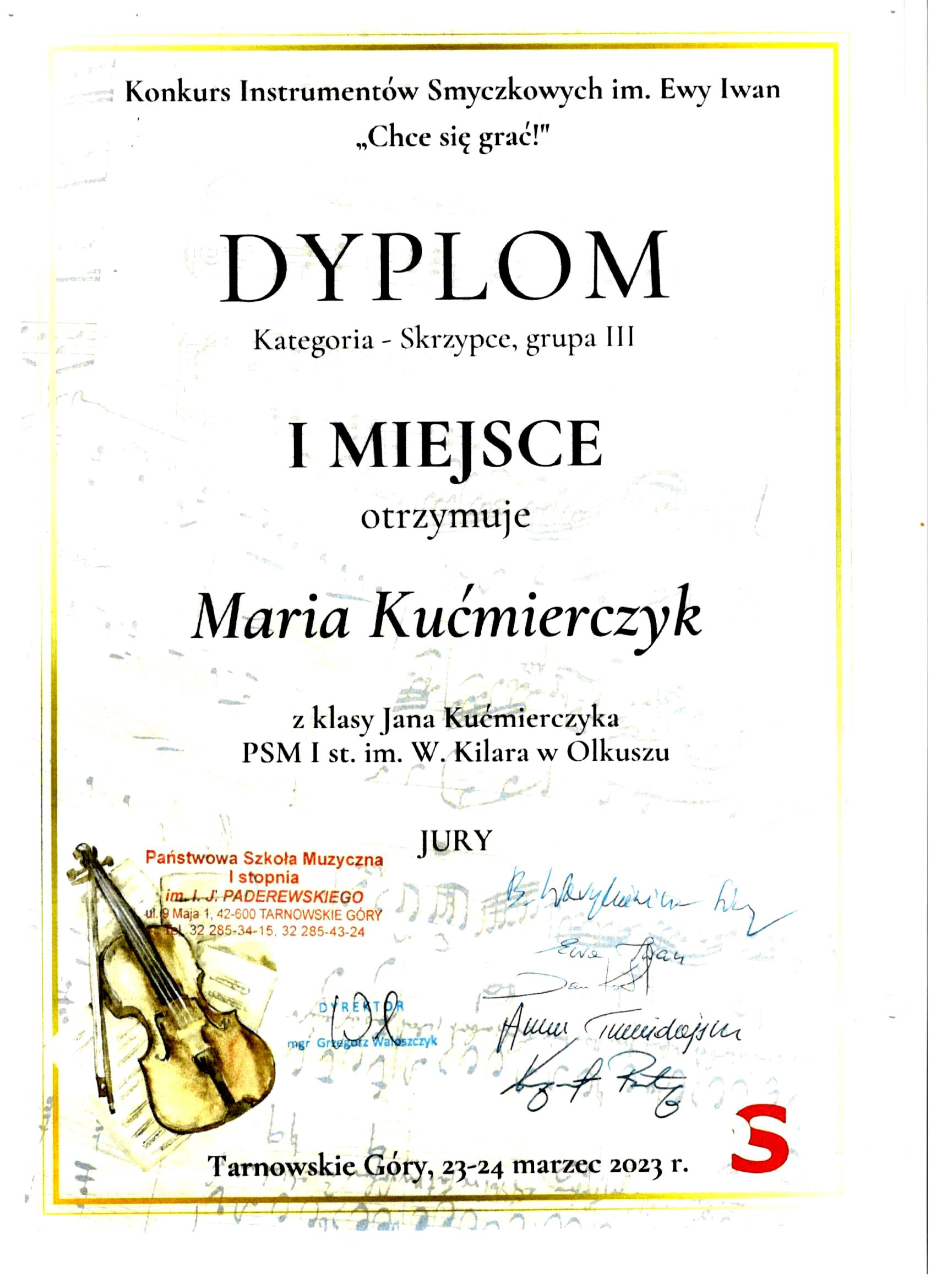 Józef Kućmierczyk zdobywcą Gran Prix oraz Maria Kućmierczyk zbobywcą I miejsca na Konkursie Instrumentów Smyczkowych im.E.Iwan "Chce Się grać" w Tarnowskich Górach. Dyplomy uznania dostali również mgr Aleksandra Naczyńska - Szlęk oraz mgr Jan Kućmierczyk. Gratulujemy!!!