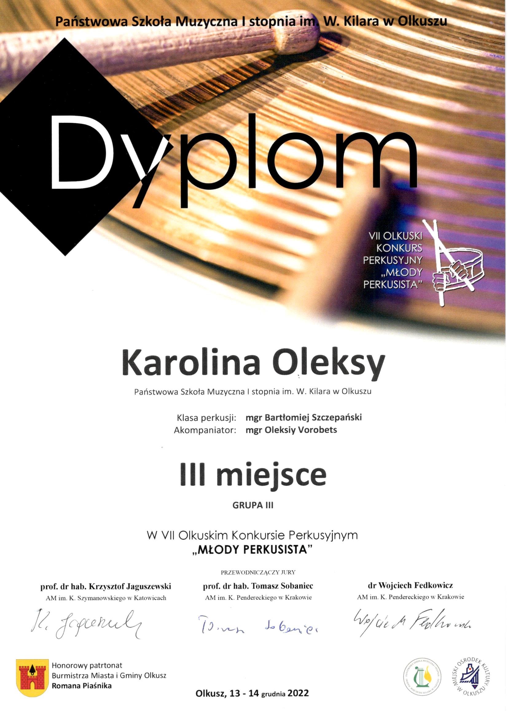 Karolina Oleksy z klasy perkusji mgr Bartłomieja Szczepańskiego zajęła III miejsce w VII Olkuskim Konkursie Perkusyjnym "Młody Perkusista". Gratulujemy!!!