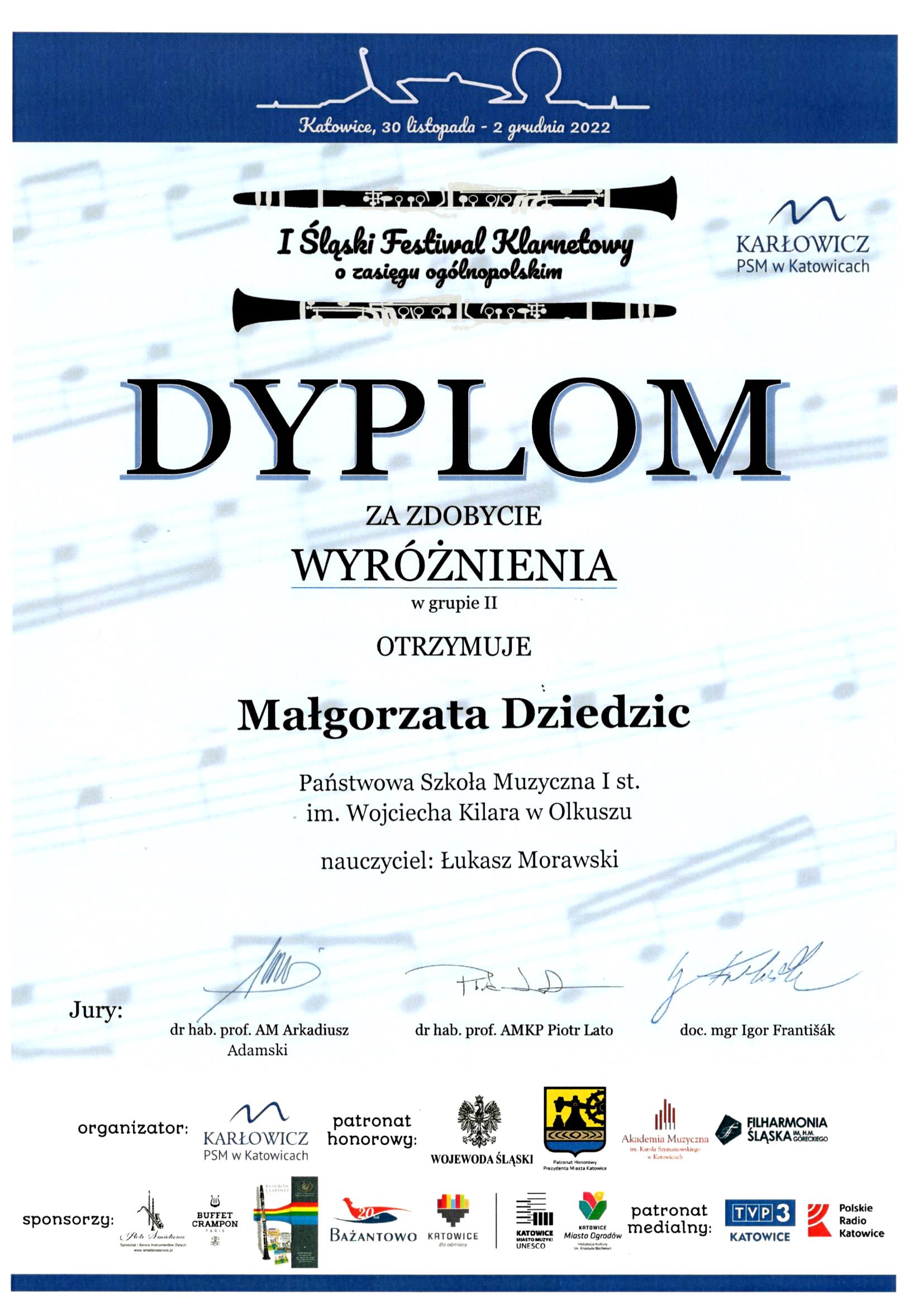 Małgorzata Dziedzic otrzymała wyróżnienie w grupie II na I Śląskim Festiwalu Klarnetowym. Gratulujemy!!!