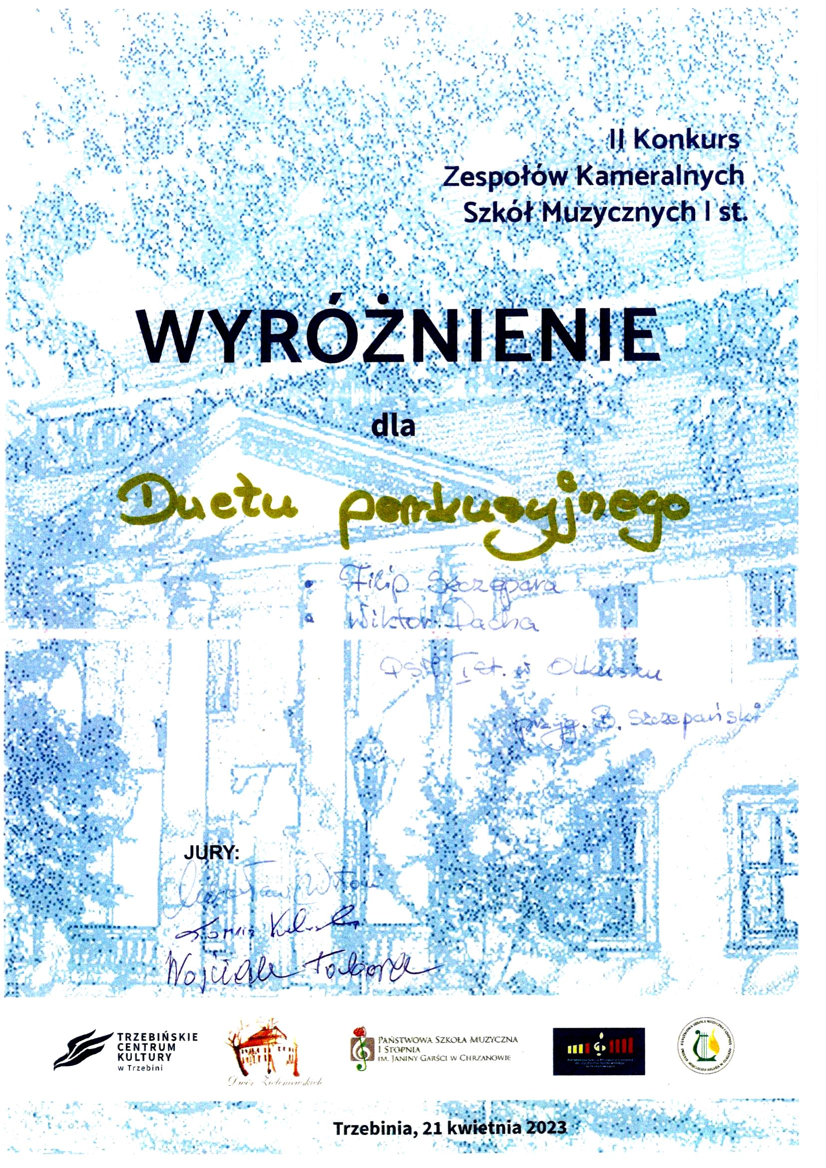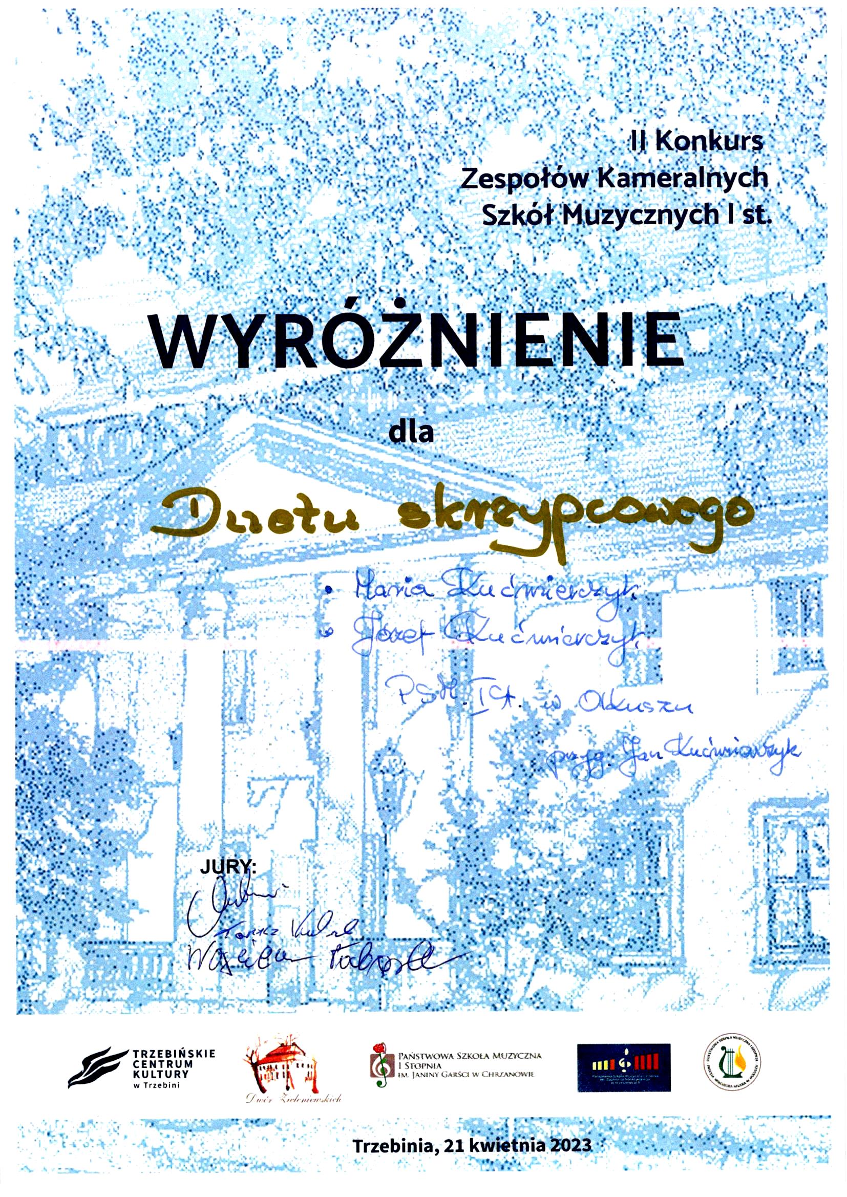 Wyróżnienie dla Zofii Rzepki i Stanisława Piątka z klasy gitary mgr Tadeusza Spyry w VI Małopolskim Konkursie Zespołów Gitarowych Krzeszowice 2023.Gratulujemy!!!