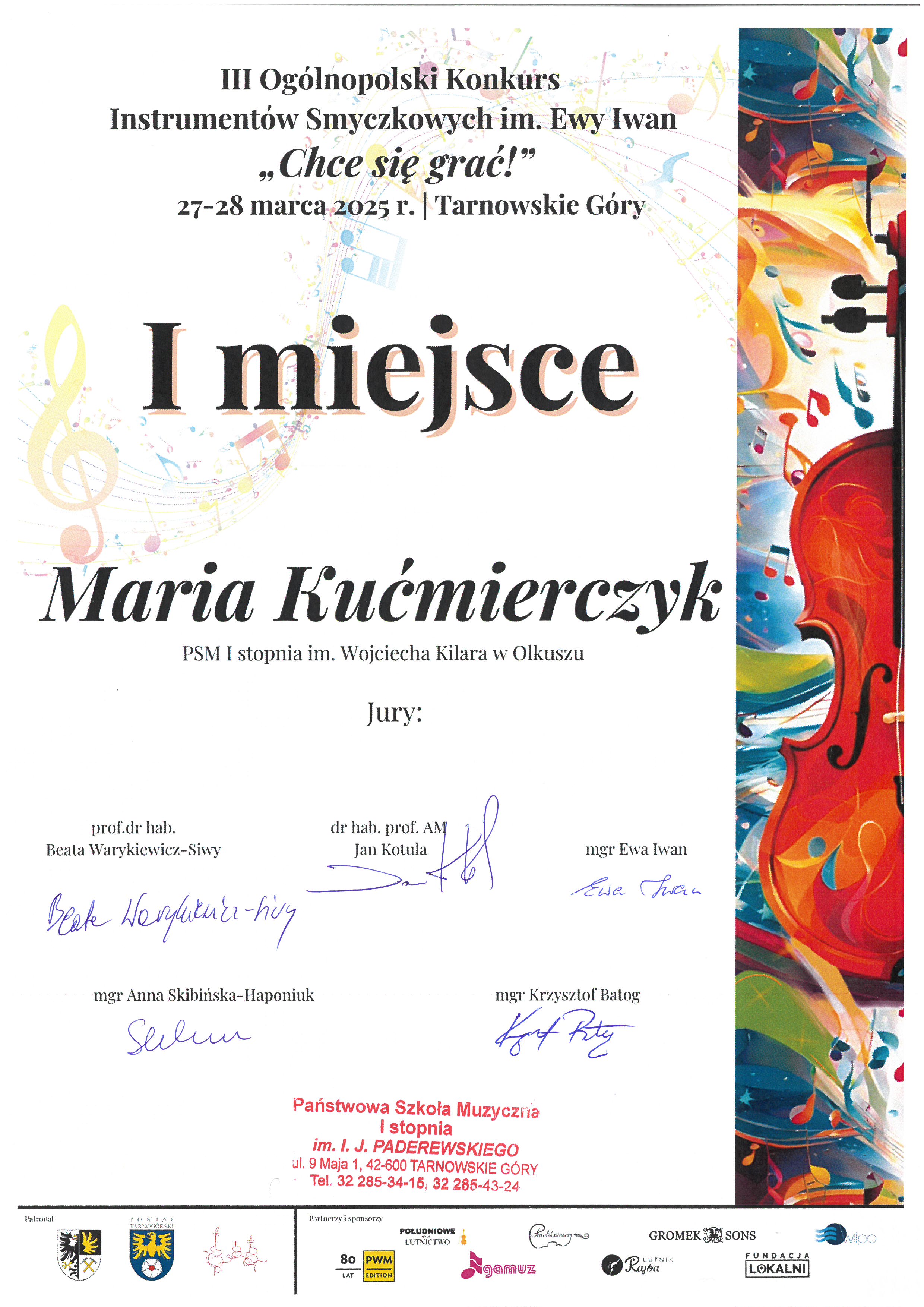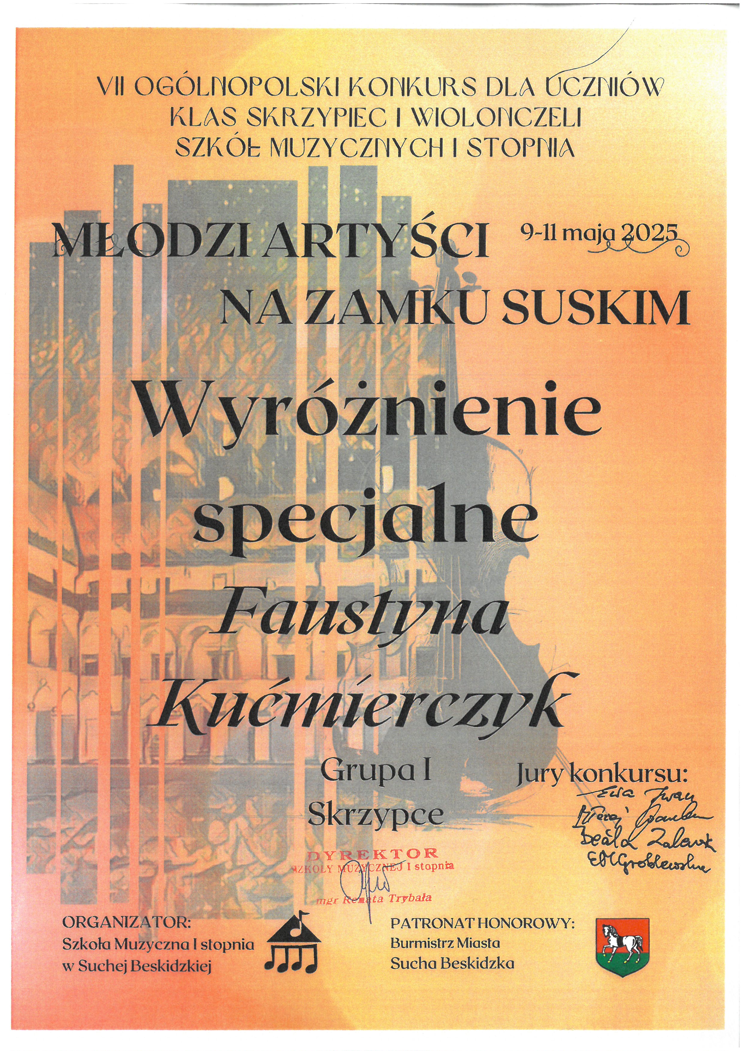 Wyróżnienie specjalne dla Faustyny Kućmierczyk z klasy skrzypiec mgr Jana Kućmierczyka na VII Ogólnopolskim Konkursie dla uczniów klas skrzypiec i wiolonczeli szkół muzycznych I stopnia "Młodzi na Zamku Suskim".Gratulujemy!!!