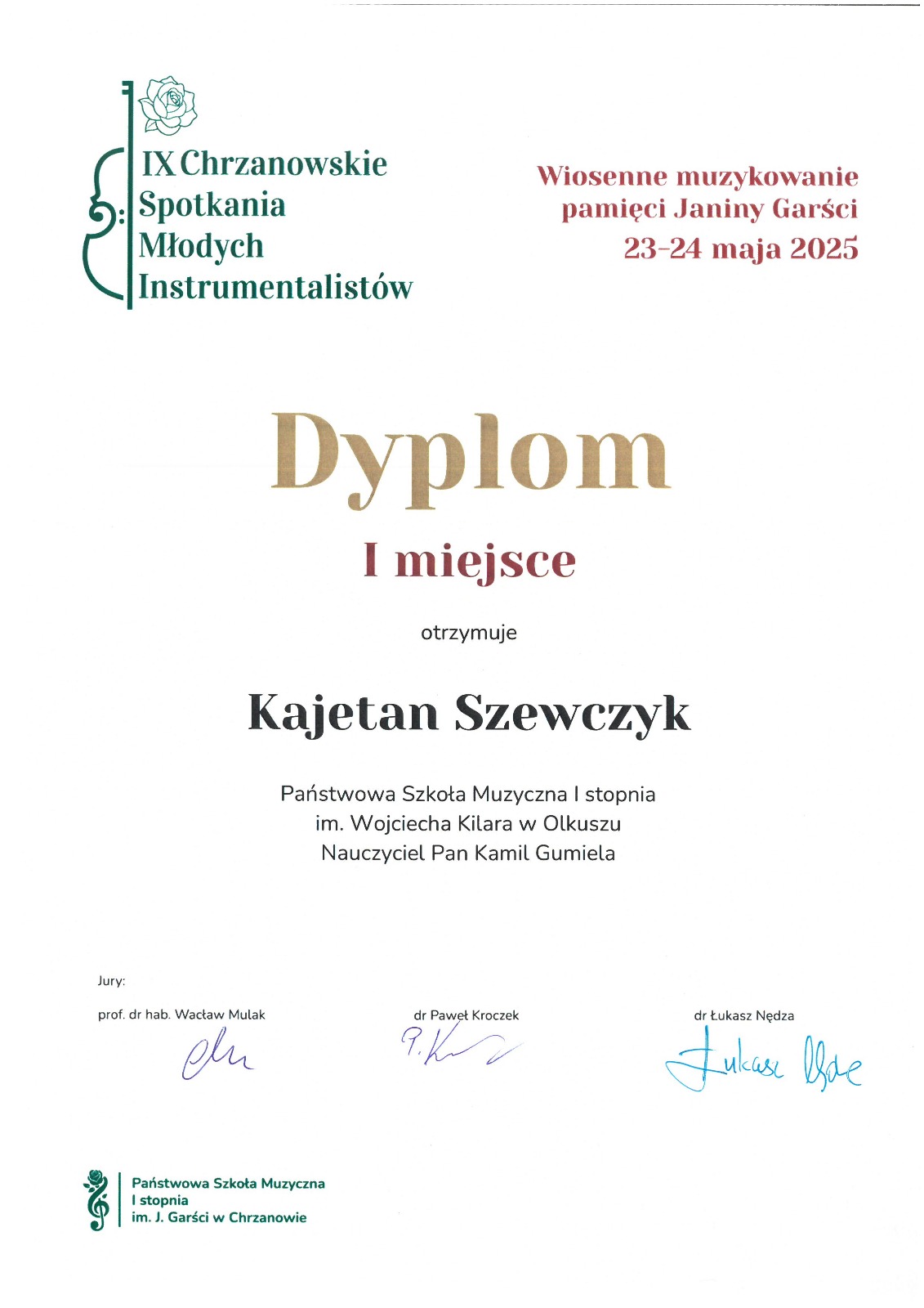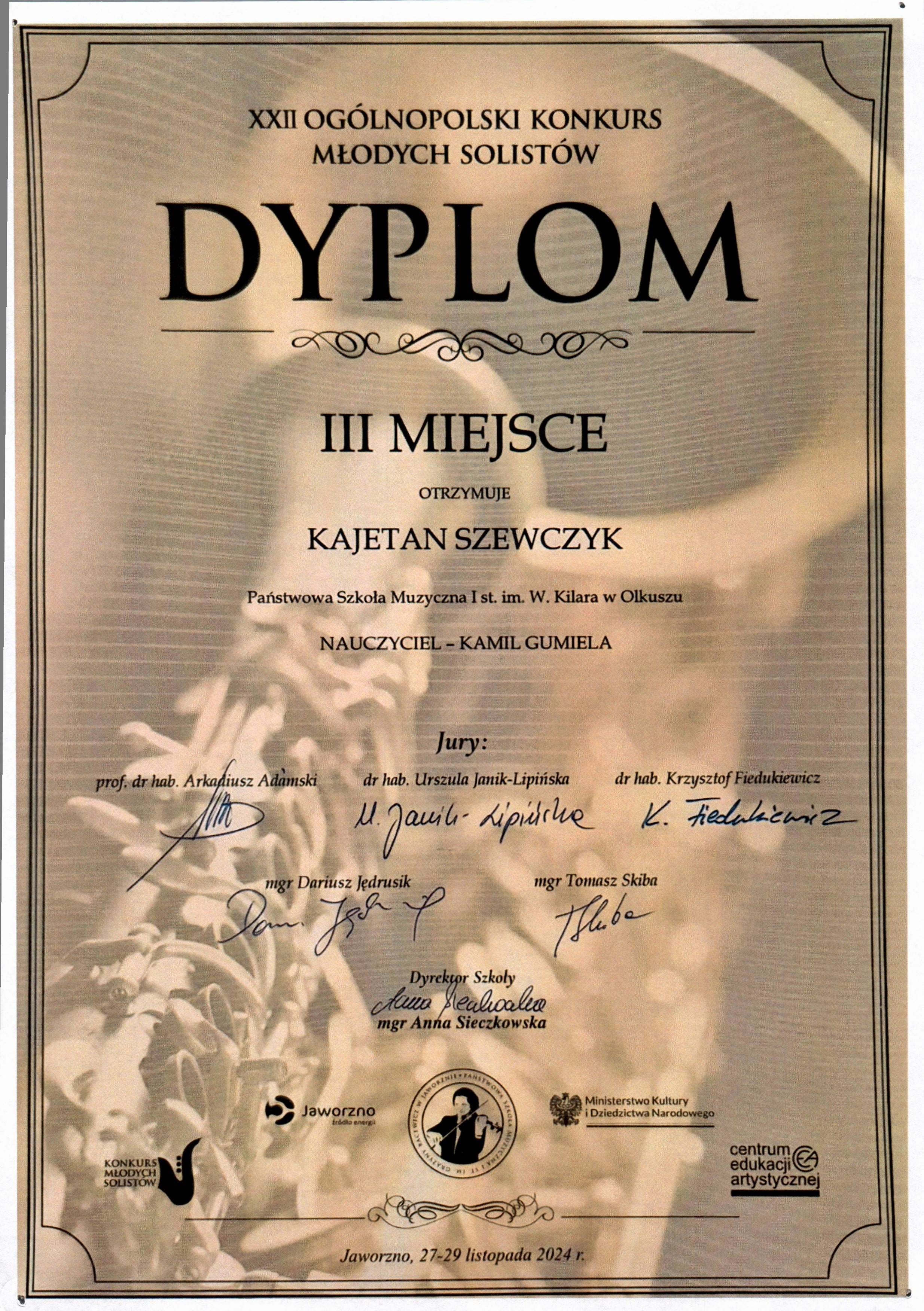 Uczeń Kajetan Szewczyk z klasy saksofonu mgr Kamila Gumieli zajął III miejsce na XXII Ogólnopolskim Konkursie Młodych Solistów w Jaworznie.