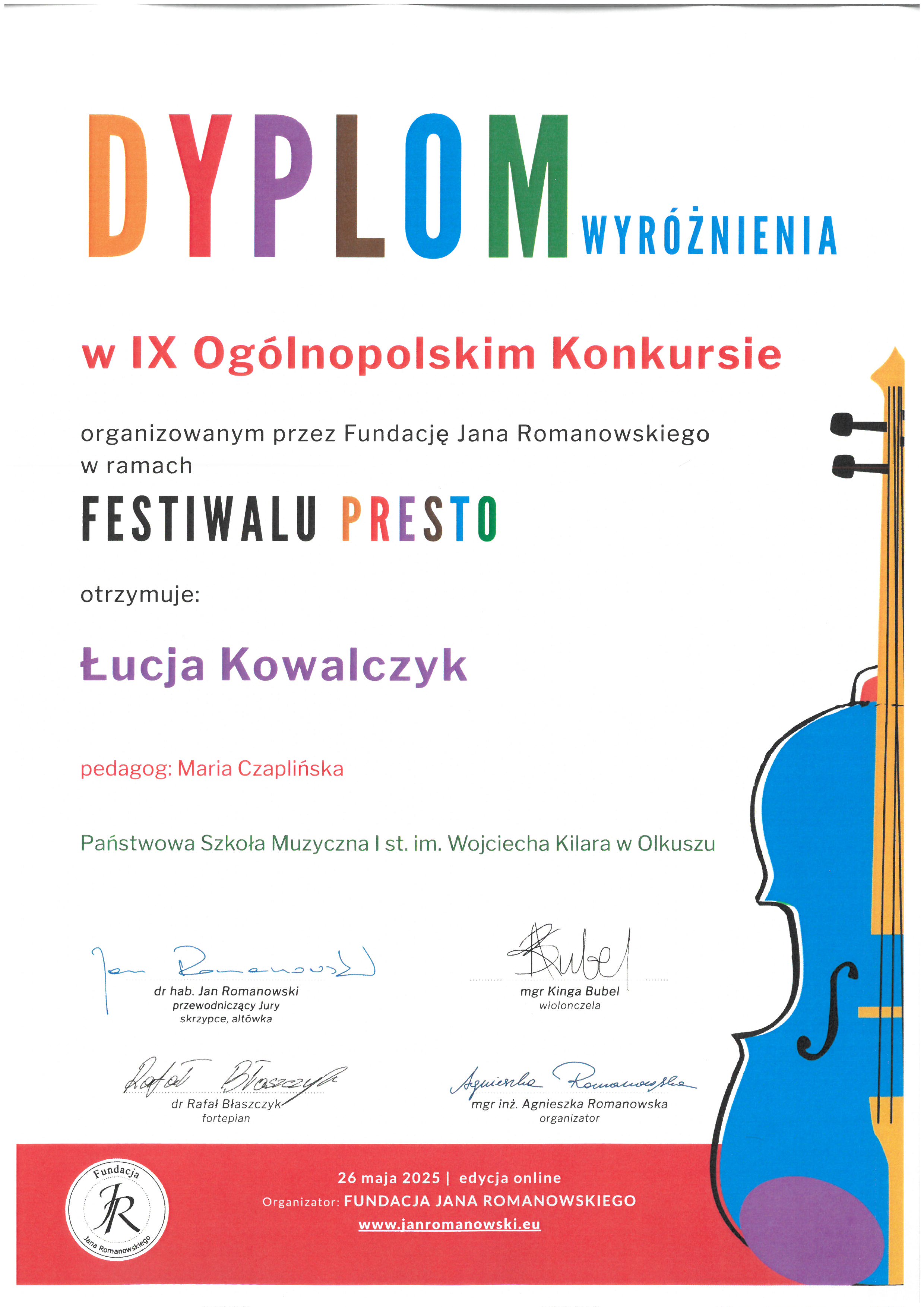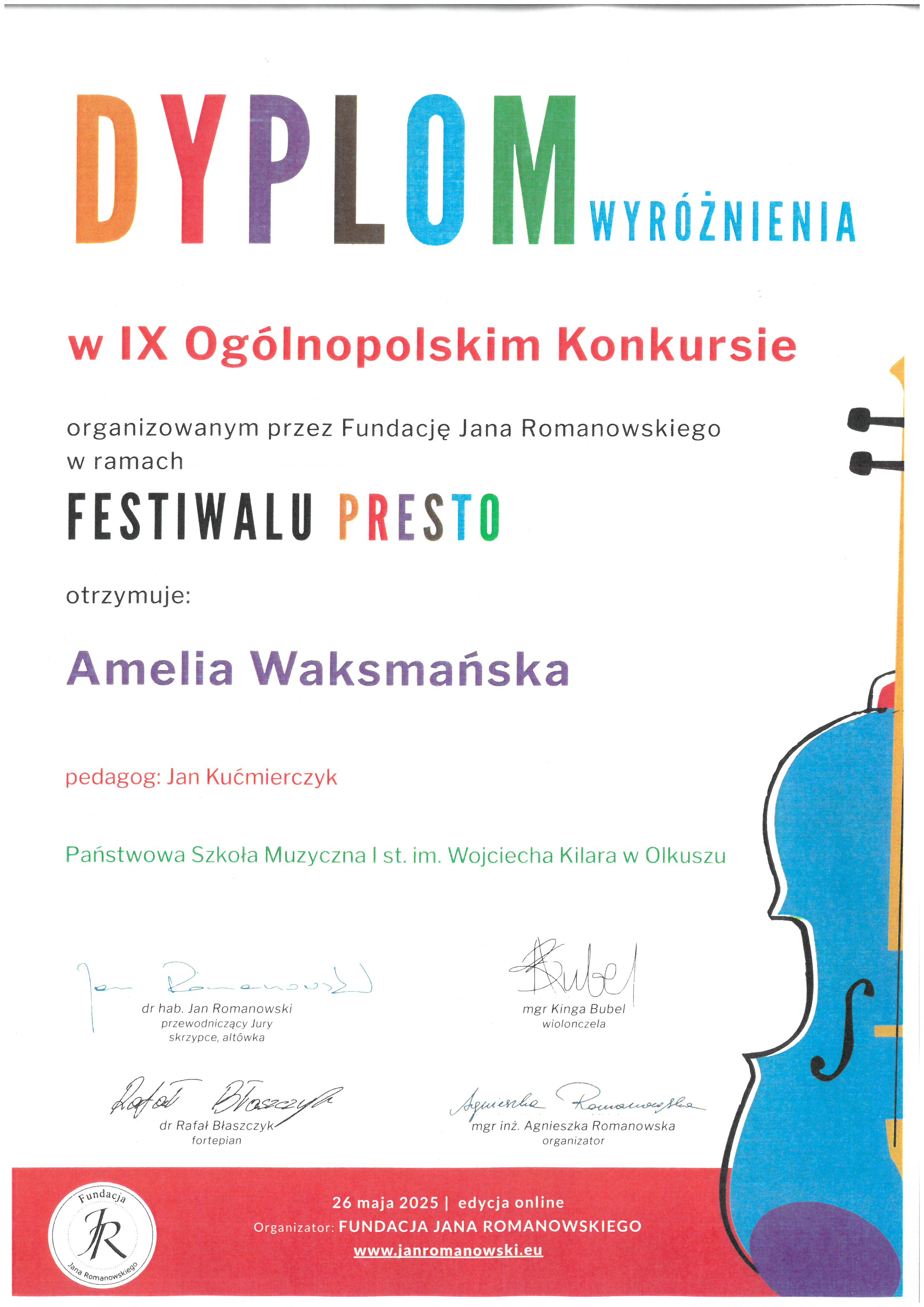 Wyróżnienie dla Amelii Waksmańskiej na IX Ogólnopolskim Konkursie w ramach Festiwalu Presto z klasy skrzypiec mgr Jana Kućmierczyka.Gratulujemy!!!