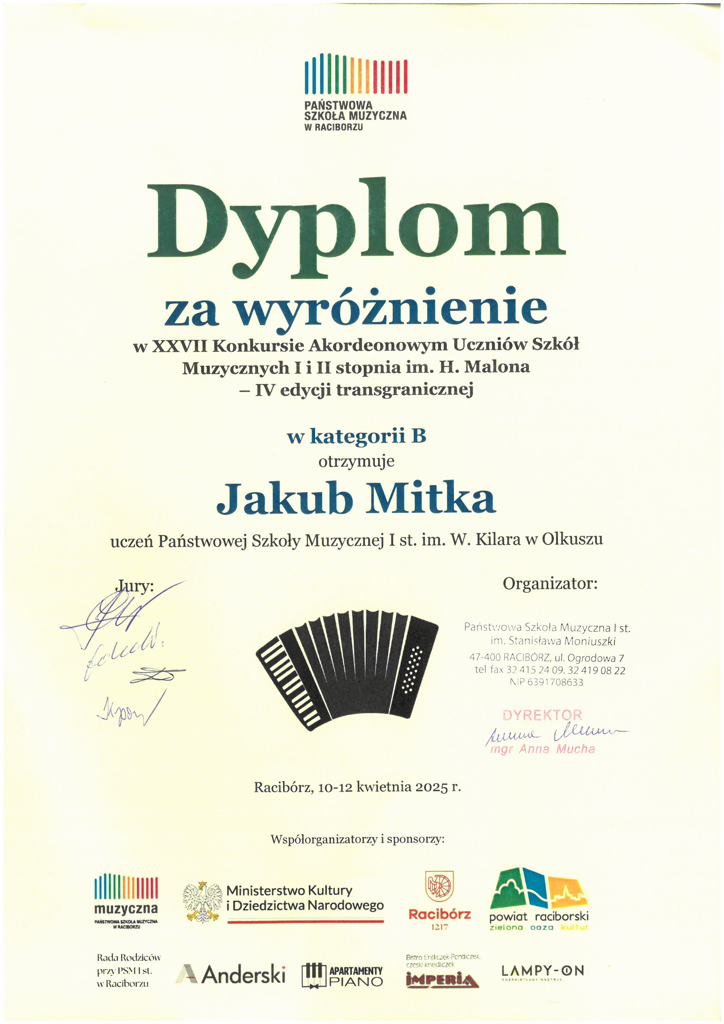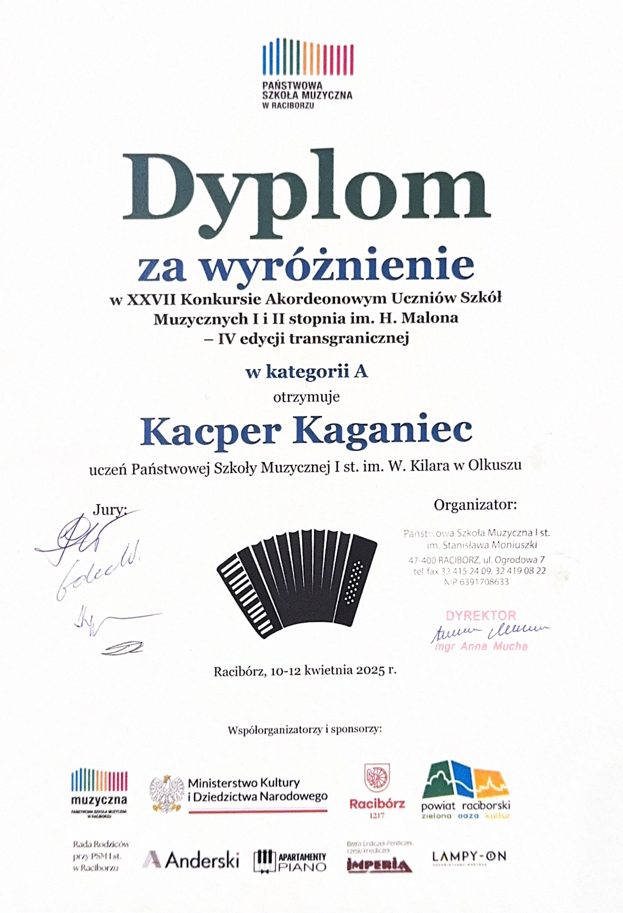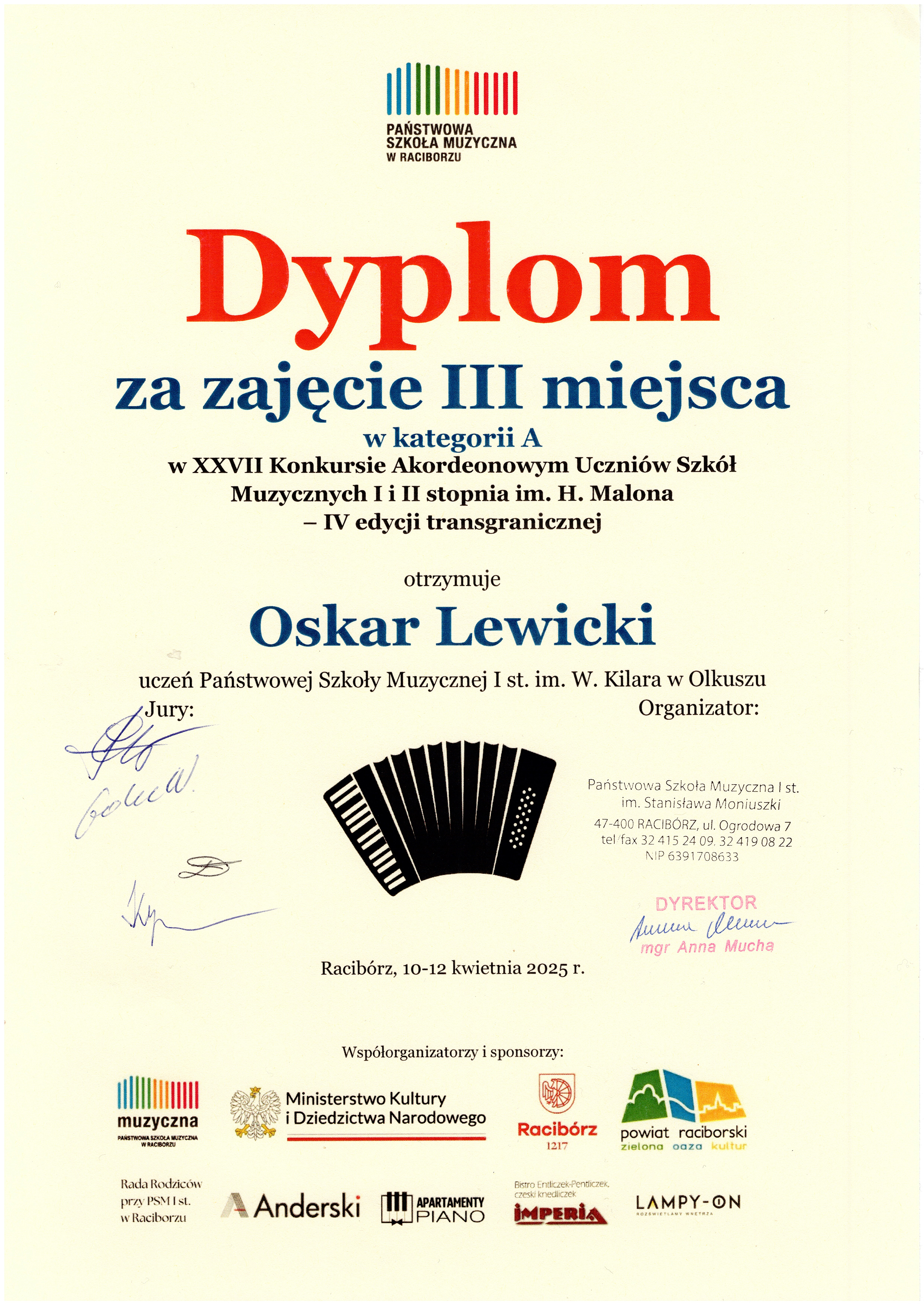 Serdecznie gratulujemy uczniom klasy akordeonu mgr Michała Kubarskiego na XXVII Konkursie Akordeonowym Uczniów Szkół Muzycznych I i II stopnia im. H. Malona , Oskarowi Lewickiemu za zajęcie III miejsca, Kacprowi Kagańcowi i Jakubowi Mitce za wyróżnienia.