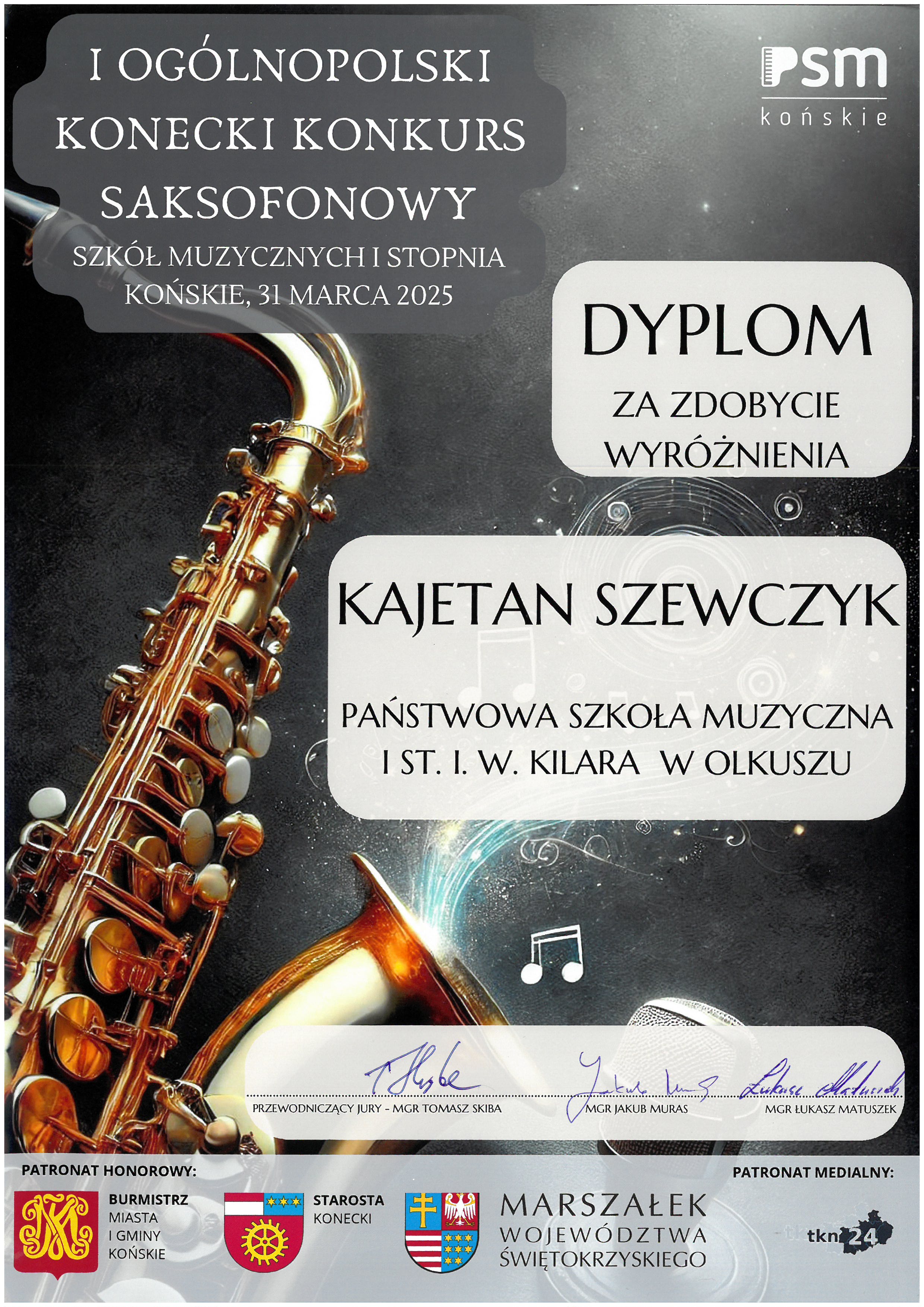Wyróżnienie dla Kajetana Szewczyka z klasy saksofonu mgr Kamila Gumieli na I Ogółnopolskim Koneckim Konkursie Saksofonowym. Gratulujemy!!!