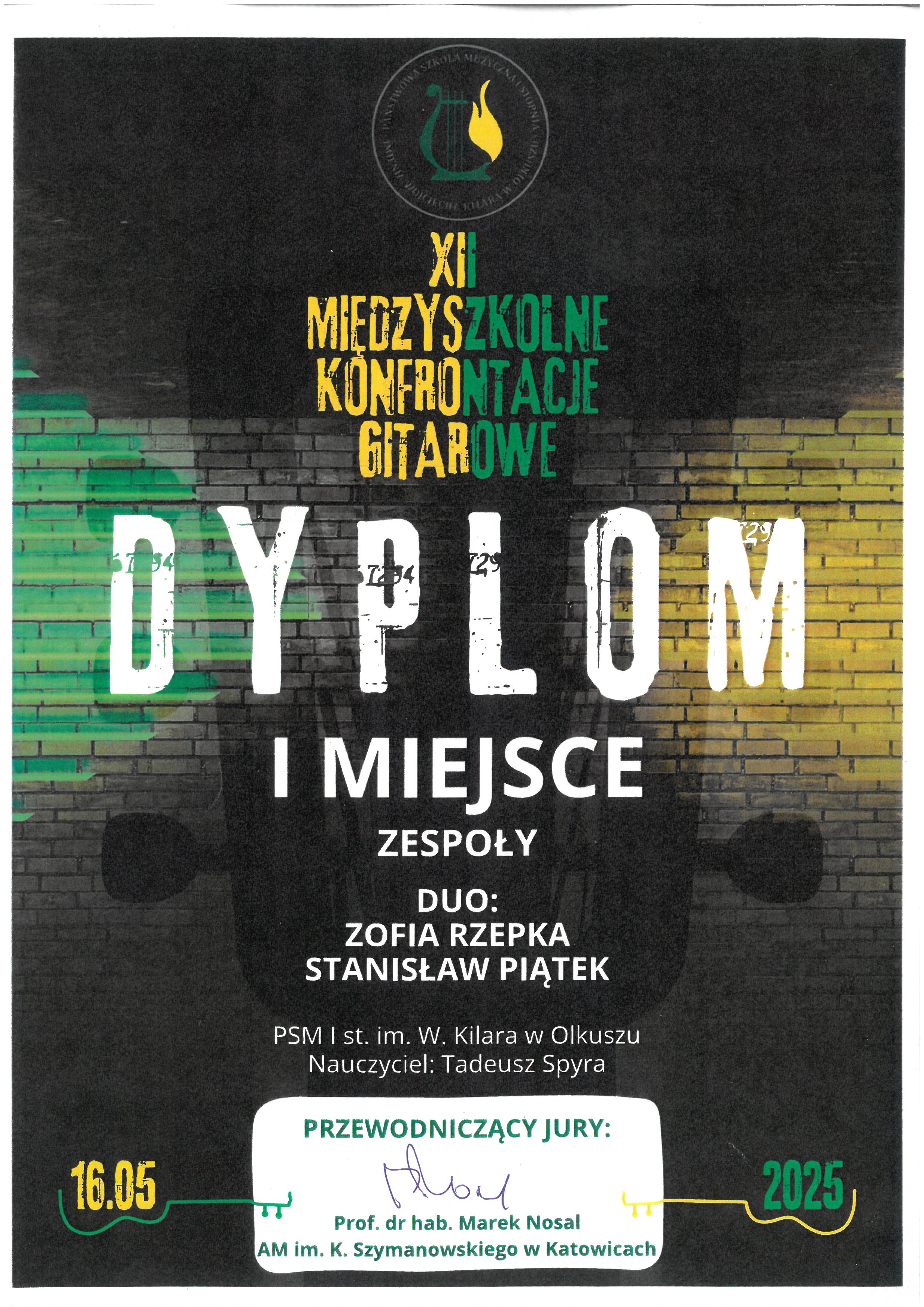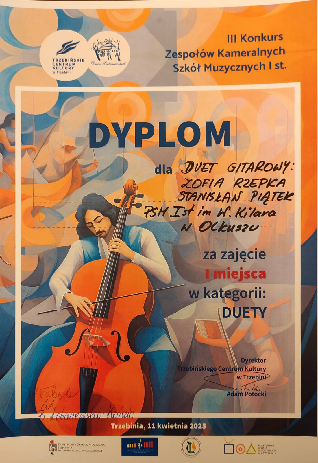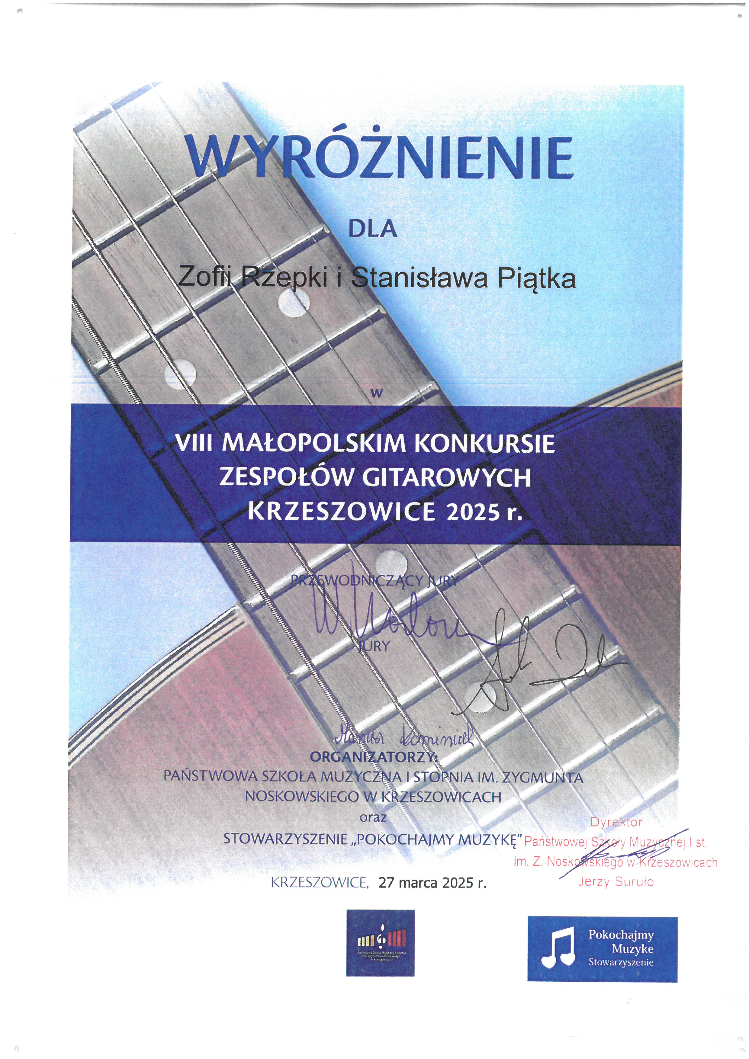 Maria Kućmierczyk (I miejsce) i Józef Kućmierczyk (II miejsce) z klasy skrzypiec mgr Jana Kućmierczyka laureatami III Ogólnopolskim Konkursie Instrumentów Smyczkowych im. Ewy Iwan "Chce się grać!" oraz wyróznienie dla Zofii Rzepki i Stanisława Piątka z klasy gitary mgr Tadeusza Spyry na VIII Małopolskim Konkursie Zespołów Gitarowych Krzeszowice 2025 r. Gratulujemy!!!