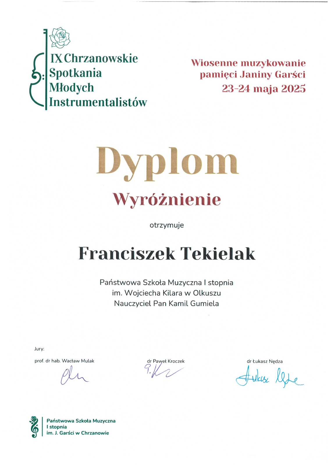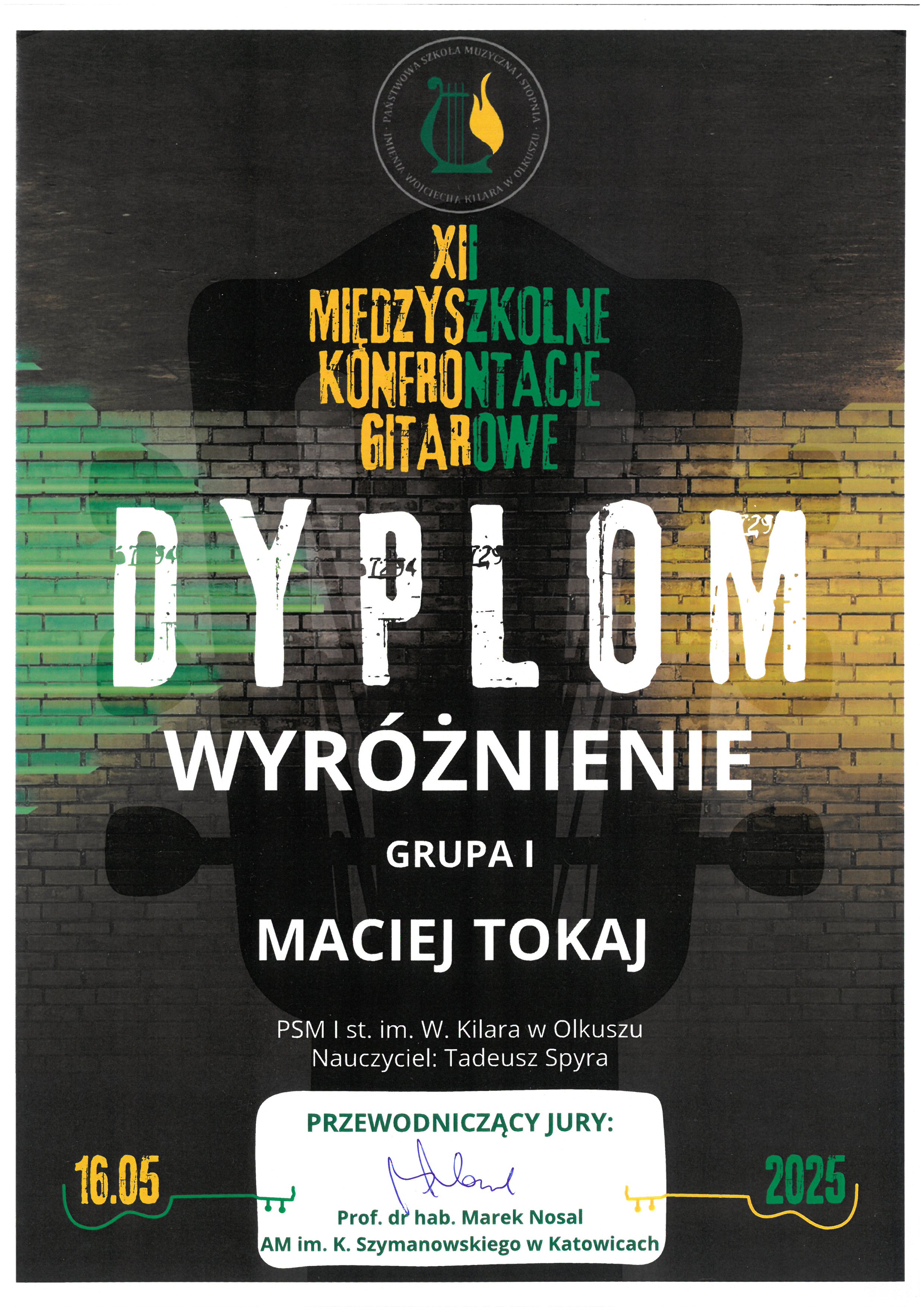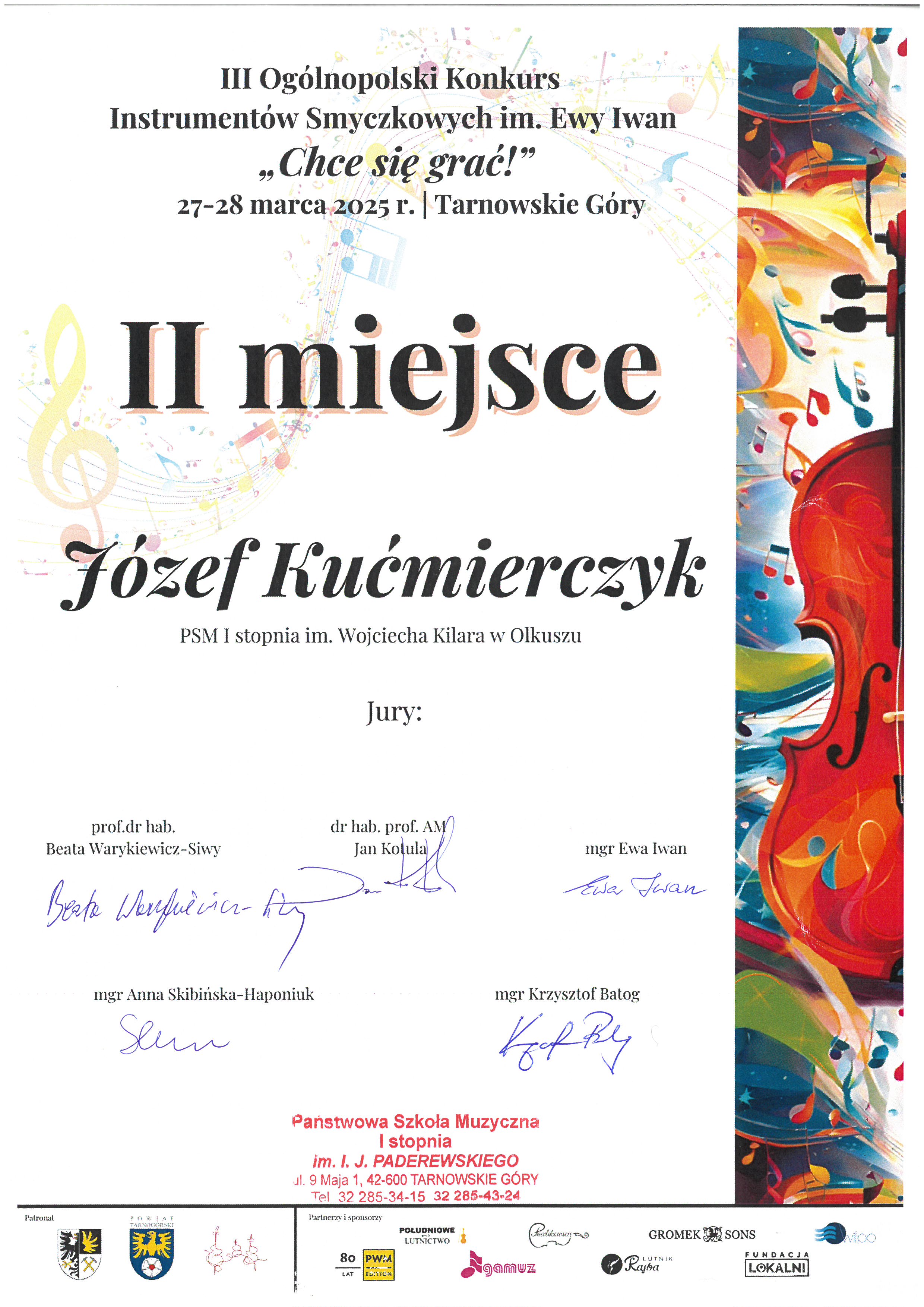 Maria Kućmierczyk (I miejsce) i Józef Kućmierczyk (II miejsce) z klasy skrzypiec mgr Jana Kućmierczyka laureatami III Ogólnopolskim Konkursie Instrumentów Smyczkowych im. Ewy Iwan "Chce się grać!" oraz wyróznienie dla Zofii Rzepki i Stanisława Piątka z klasy gitary mgr Tadeusza Spyry na VIII Małopolskim Konkursie Zespołów Gitarowych Krzeszowice 2025 r. Gratulujemy!!!