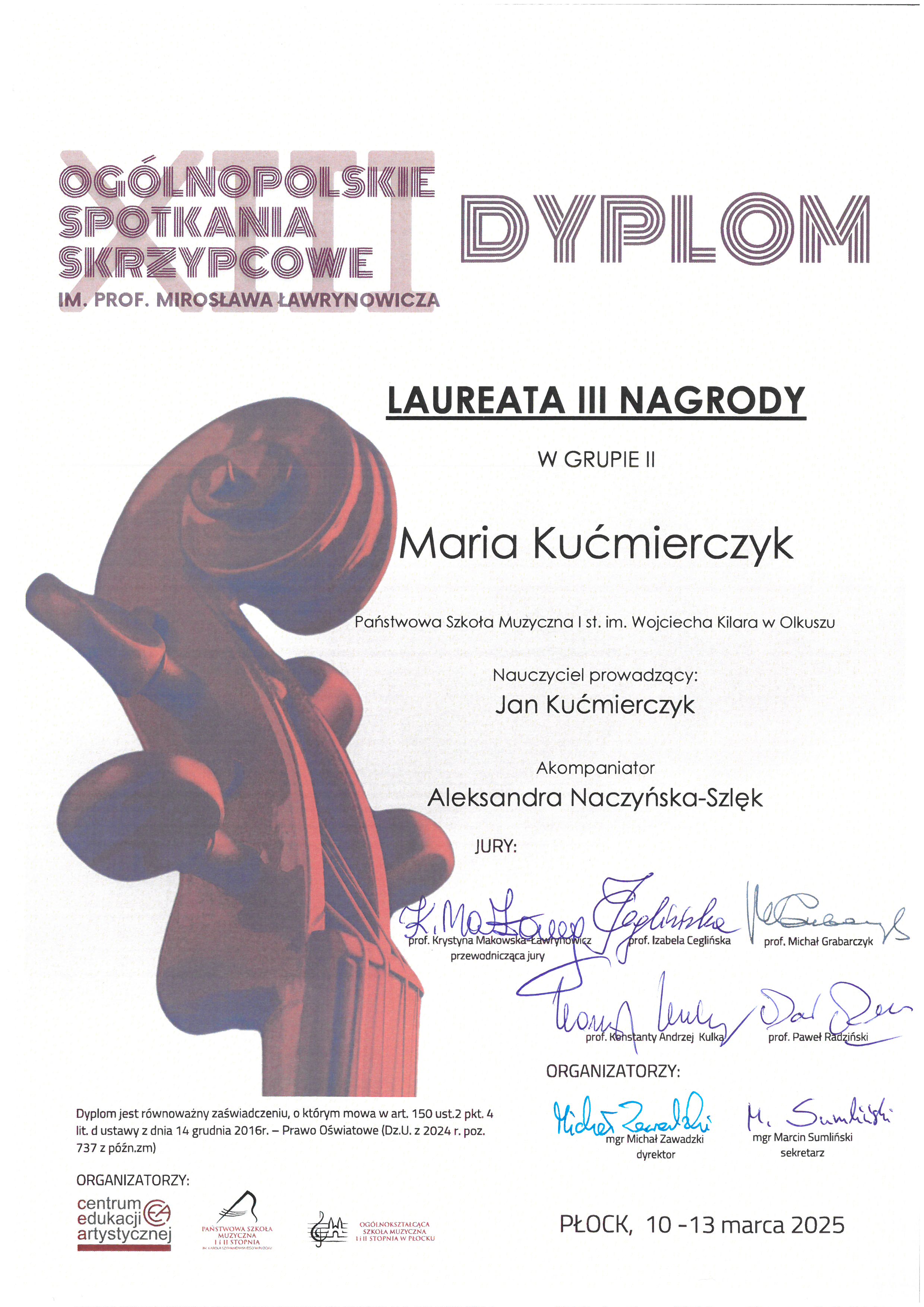 Laureatami III miejsca w grupie II na XIII Ogólnopolskich Spotkaniach Skrzypcowych im. Mirosława Ławrynowicza zostali Józef Kućmierczyk i Maria Kućmierczyk z klasy skrzypiec mgr Jana Kućmierczyka. Gratulujemy!!