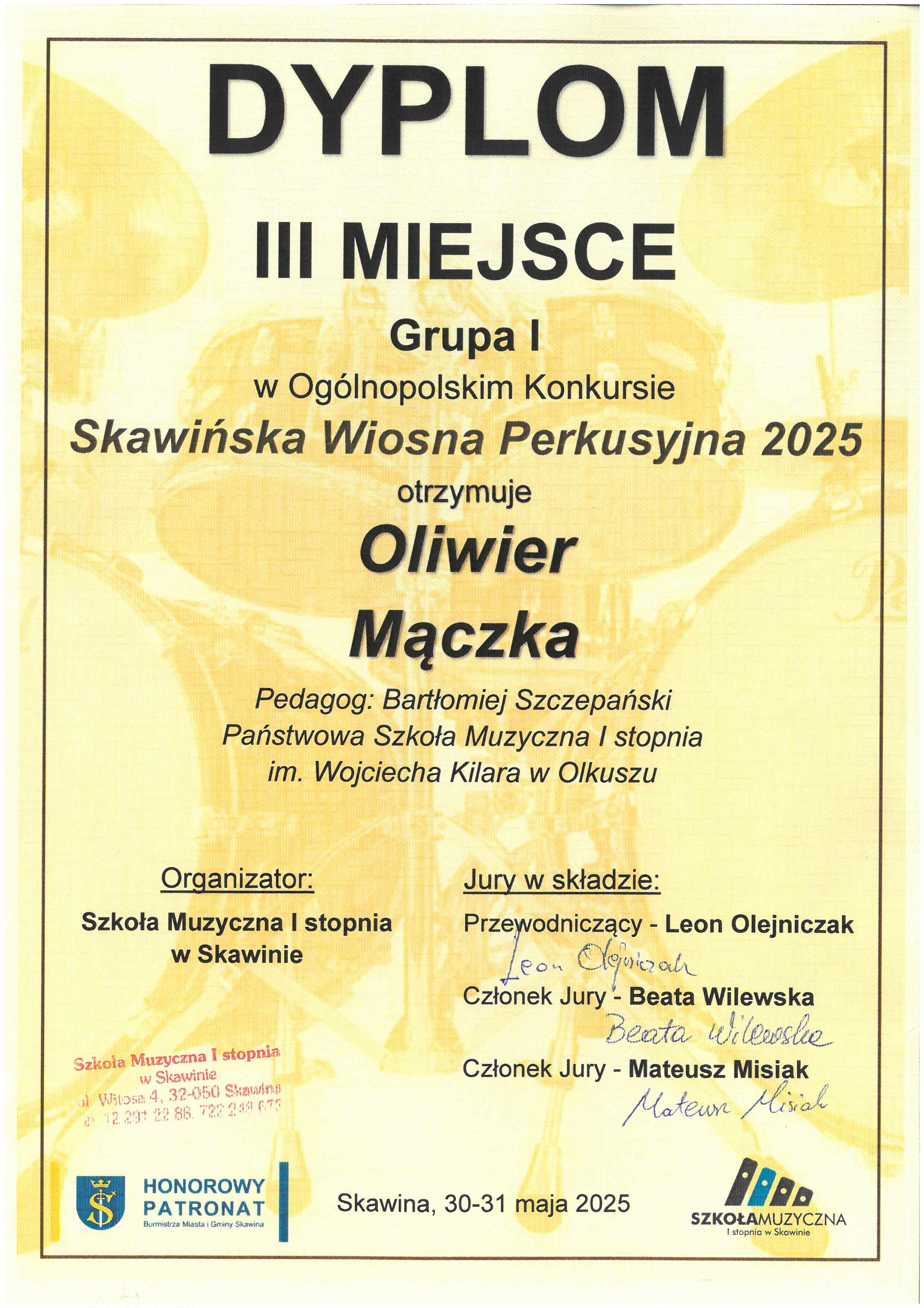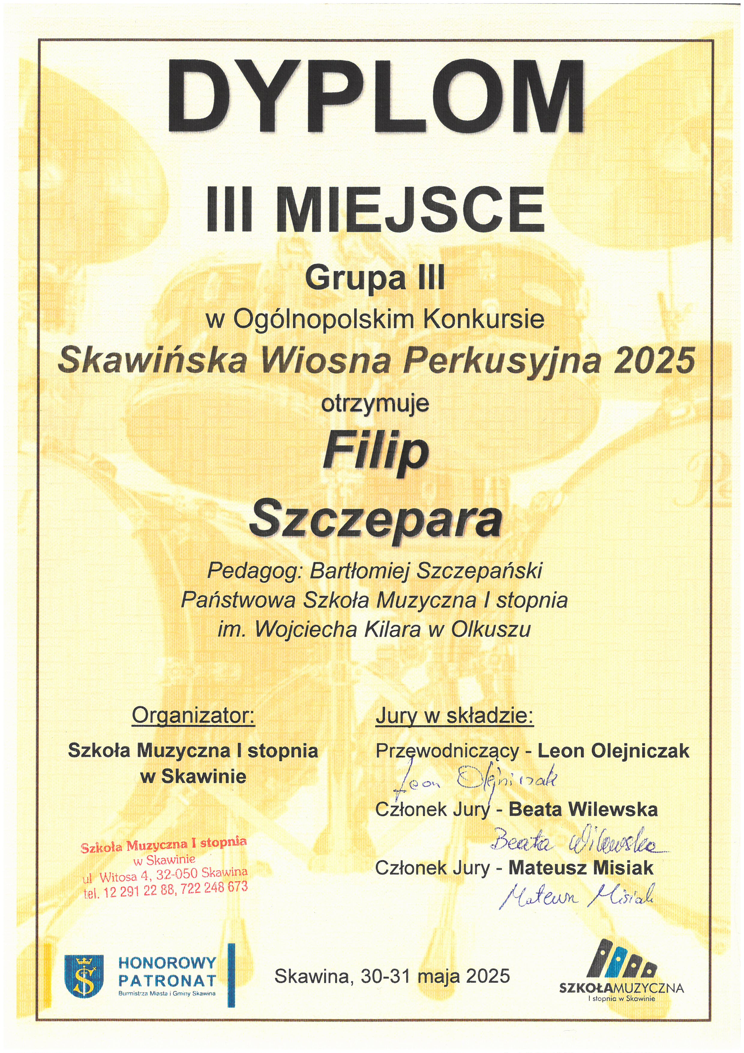 III miejsce w grupie I dla Oliwiera Mączki oraz III miejsce w grupie III dla Filipa Szczepary z klasy perkusji mgr Bartłomieja Szczepańskiego na Ogólnopolskim Konkursie "Skawińska Wiosna Perkusyjna". Wyróżnienie dla mgr Oleksiya Vorobetsa za akompaniament. Gratulujemy!!!