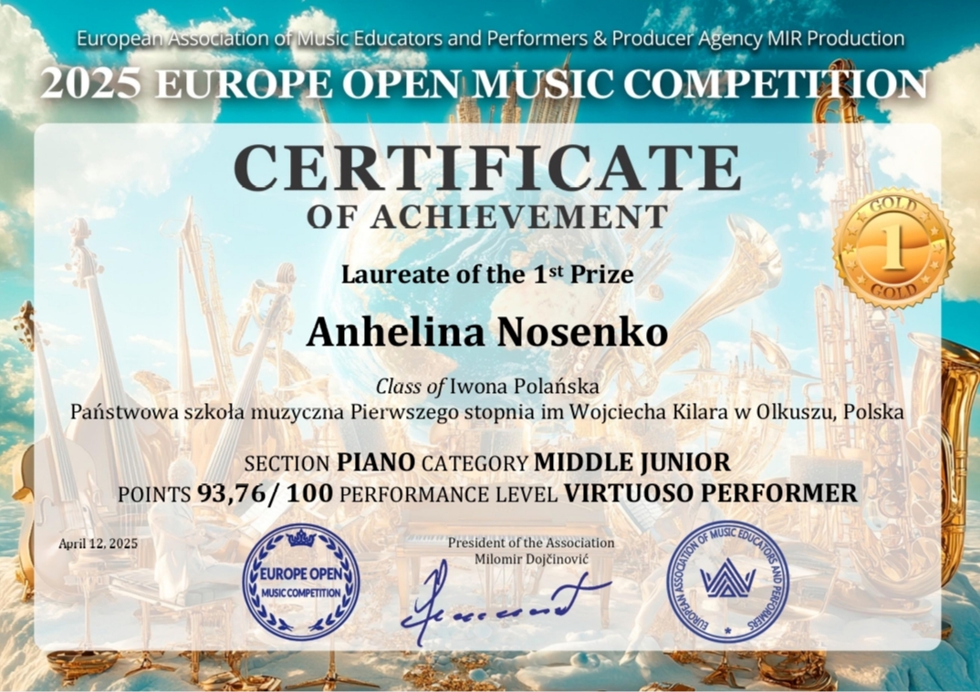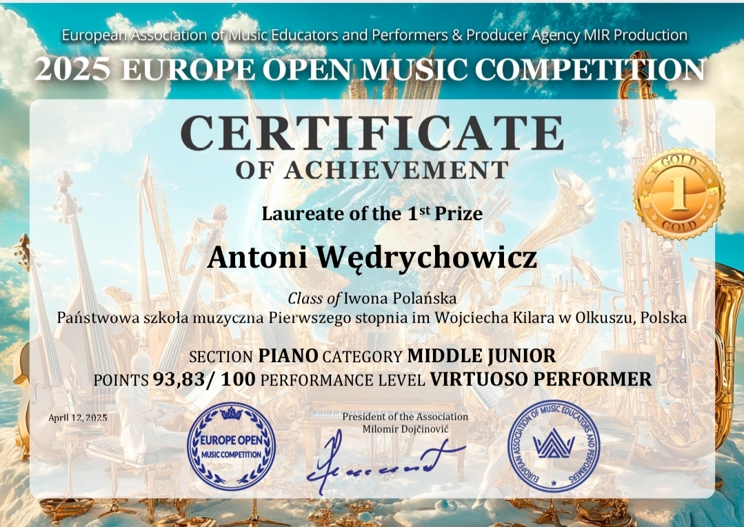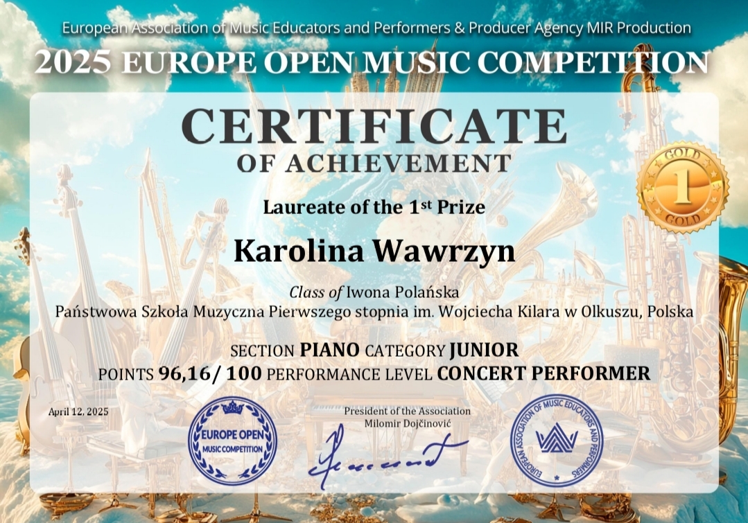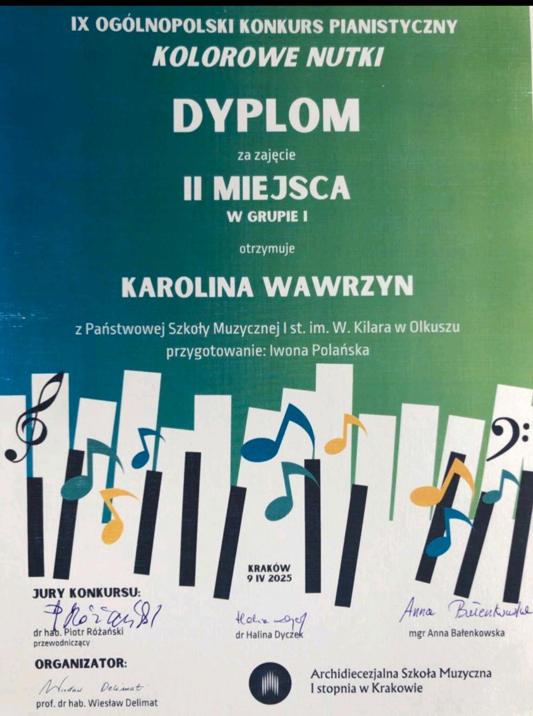 Serdecznie gratulujemy Karolinie Wawrzyn z klasy fortepianu mgr Iwony Polańskiej laureatce II miejsca na IX Ogólnopolskim Konkursie Pianistycznym "Kolorowe Nutki". Gratulujemy także Karolinie Wawrzyn, Anhelinie Nosenko oraz Antoniemu Wędrychowiczowi za zdobycie pierwszych nagród na 2025 Europe Open Music Competition. Szczególne wyróżnienie dla nauczyciela Pani mgr Iwony Polańskiej.