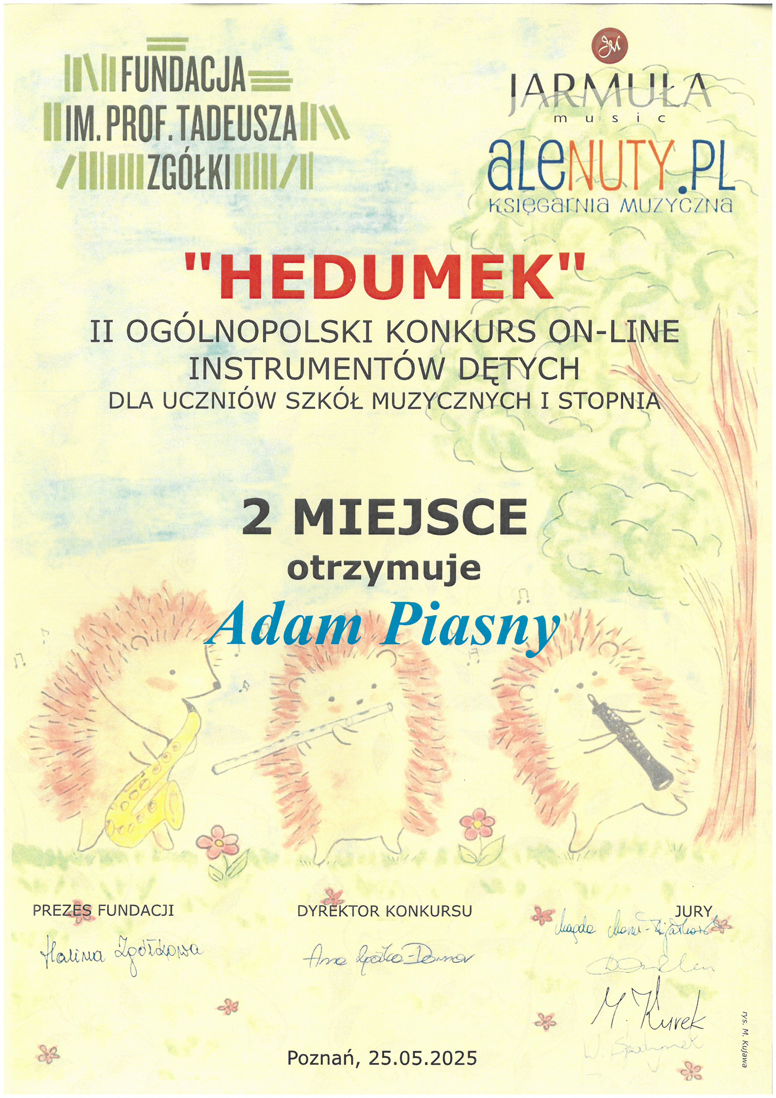 II miejsce dla Adama Piasnego z klasy saksofonu mgr Marii Gęgotek na II Ogólnopolskim Konkursie On-Line Instrumentów Dętych "Hedumek".Gratulujemy!!!