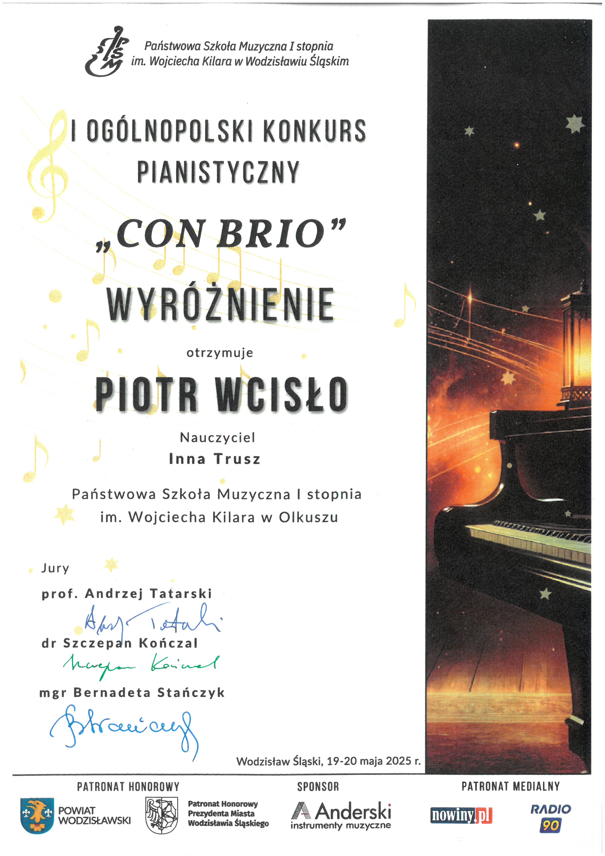 Wyróżnienie dla Piotra Wcisło z klasy fortepianu mgr Inny Trusz na I Ogólnopolskim Konkursie Pianistycznym "Con Brio" oraz dyplom za wzorowe przygotowanie ucznia dla mgr Inny Trusz. Gratulujemy!!!