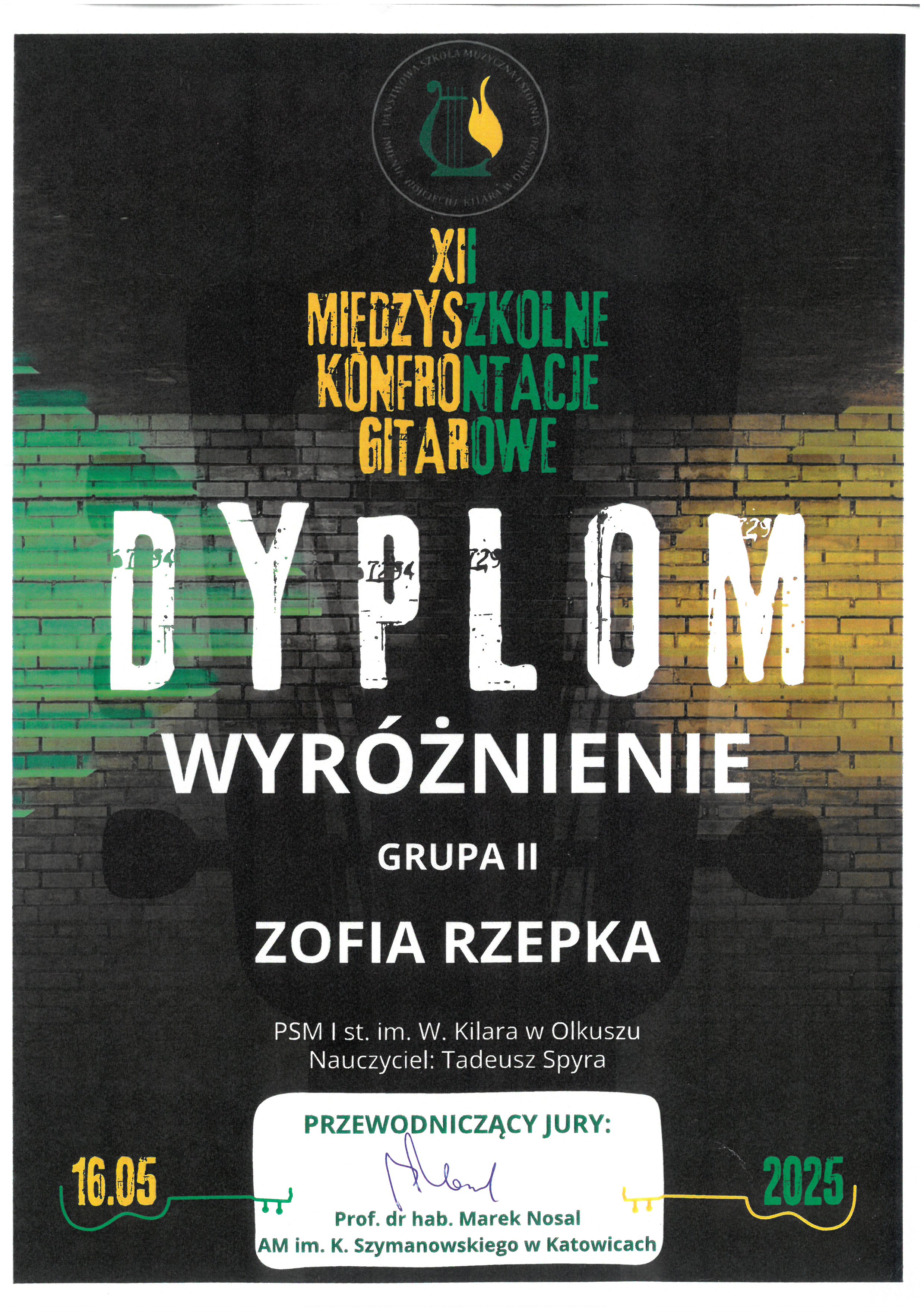 Uczennica Zofia Rzepka z klasy gitary mgr Tadeusza Spyry zajęła II miejsce ex aequo w grupie II na XVIII Mikołajkowym Konkursie Gitarowym dla dzieci w Rybniku.