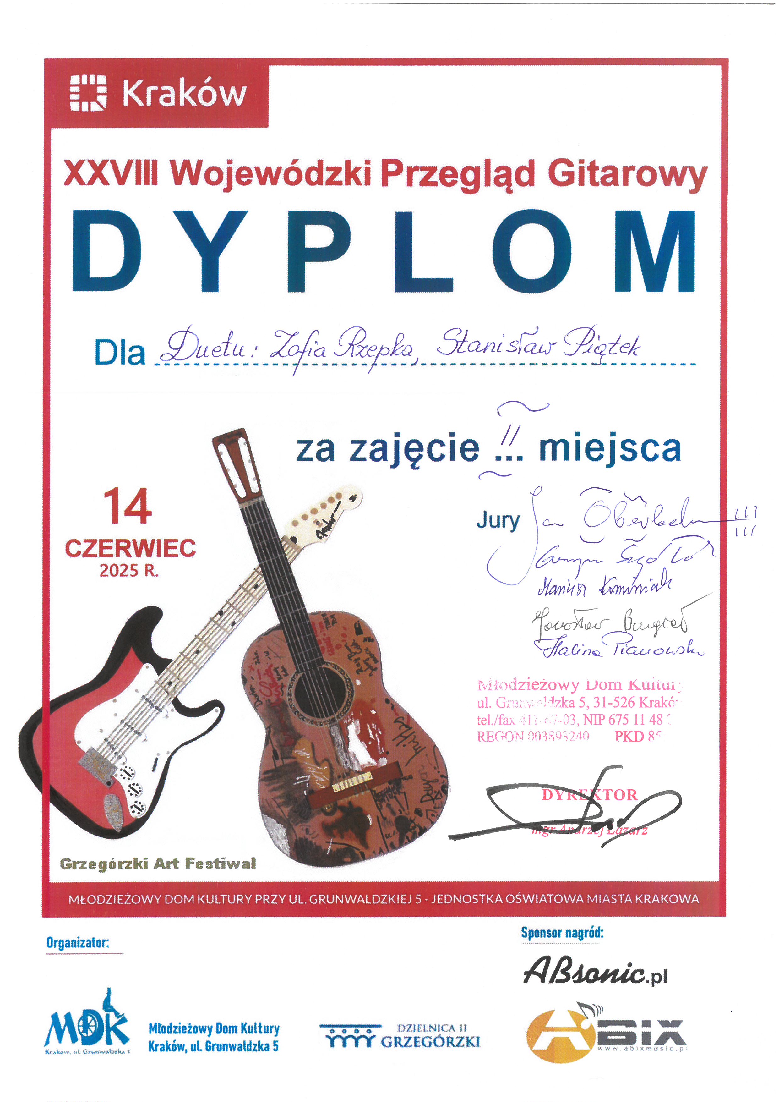 II miejsce dla duetu gitarowego Zofia Rzepka i Stanisław Piątek z klasy gitary mgr Tadeusza Spyry na XXVIII Wojewódzkim Przeglądzie Gitarowym. Gratulujemy!!1