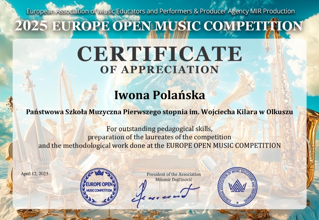 Serdecznie gratulujemy Karolinie Wawrzyn z klasy fortepianu mgr Iwony Polańskiej laureatce II miejsca na IX Ogólnopolskim Konkursie Pianistycznym "Kolorowe Nutki". Gratulujemy także Karolinie Wawrzyn, Anhelinie Nosenko oraz Antoniemu Wedrychowiczowi za zdobycie pierwszych nagród na 2025 Europe Open Music Competition. Szczególne wyróżnienie dla nauczyciela Pani mgr Iwony Polańskiej.