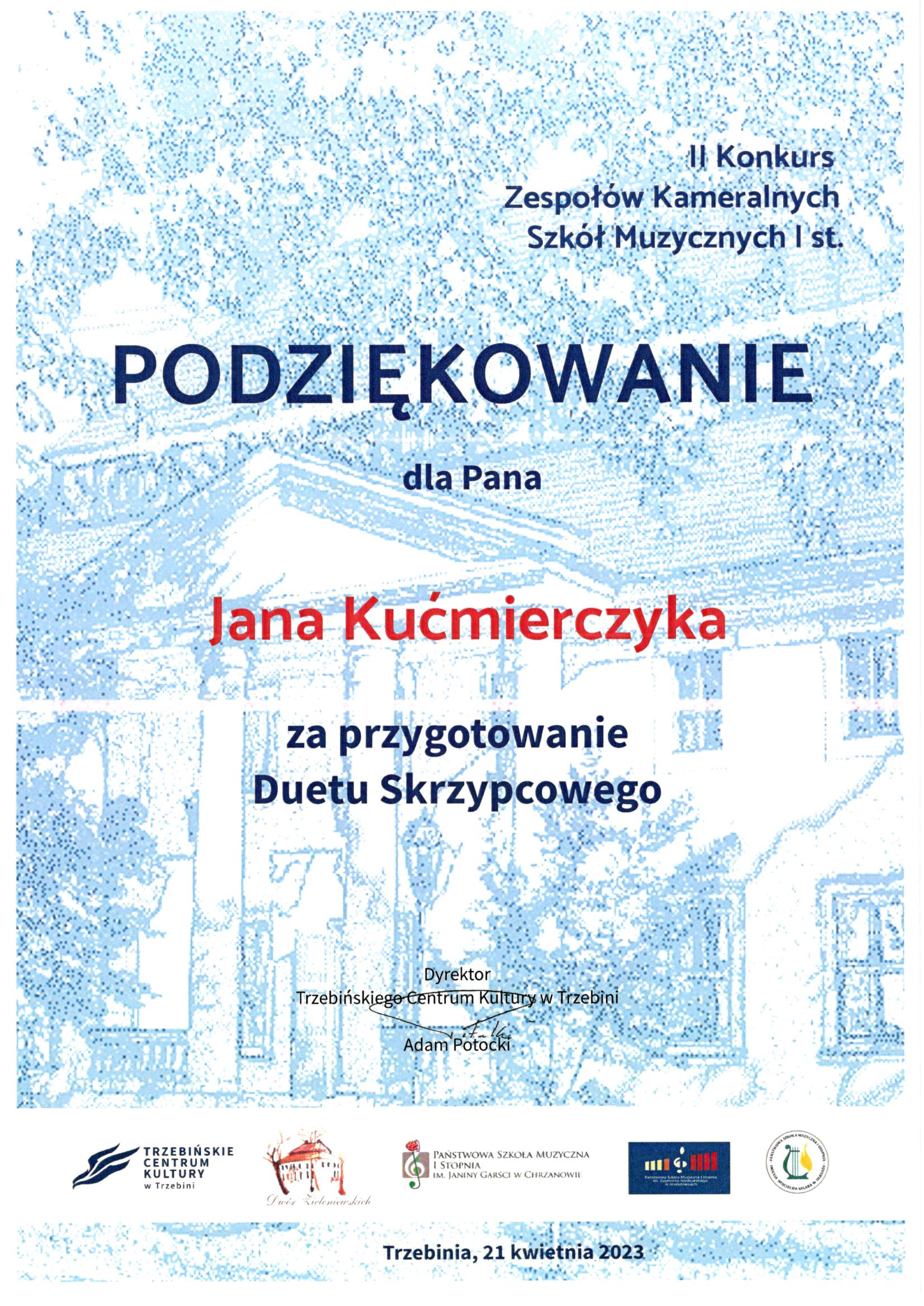 Wyróżnienia dla duetu perkusyjnego w składzie: Wiktor Pacha, Filip Szczepara, dla duetu skrzypcowego Maria i Józef Kućmierczyk, dla trio gitarowego Alicja Adamus, Jan Kaszuba, Wawrzyniec Rogalski na II Konkursie Zespołów Kameralnych Szkół Muzycznych I stopnia w Trzebinii. Gratulujemy!!!