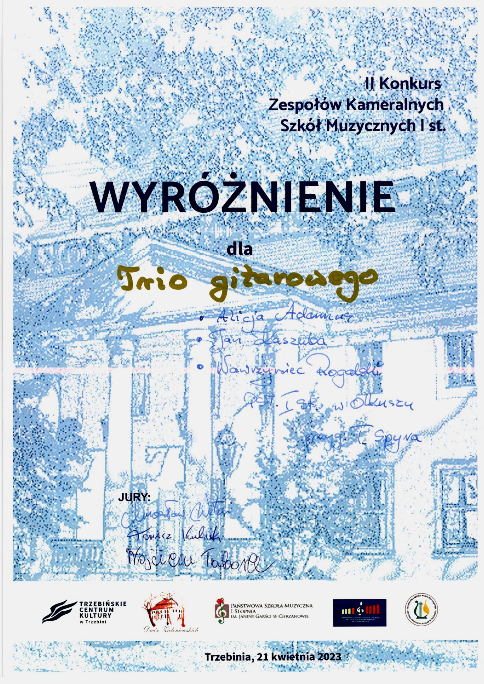 Wyróżnienia dla zespołów na II Konkursie Zespołów Kameralnych Szkół Muzycznych I stopnia - Trzebinia 2023