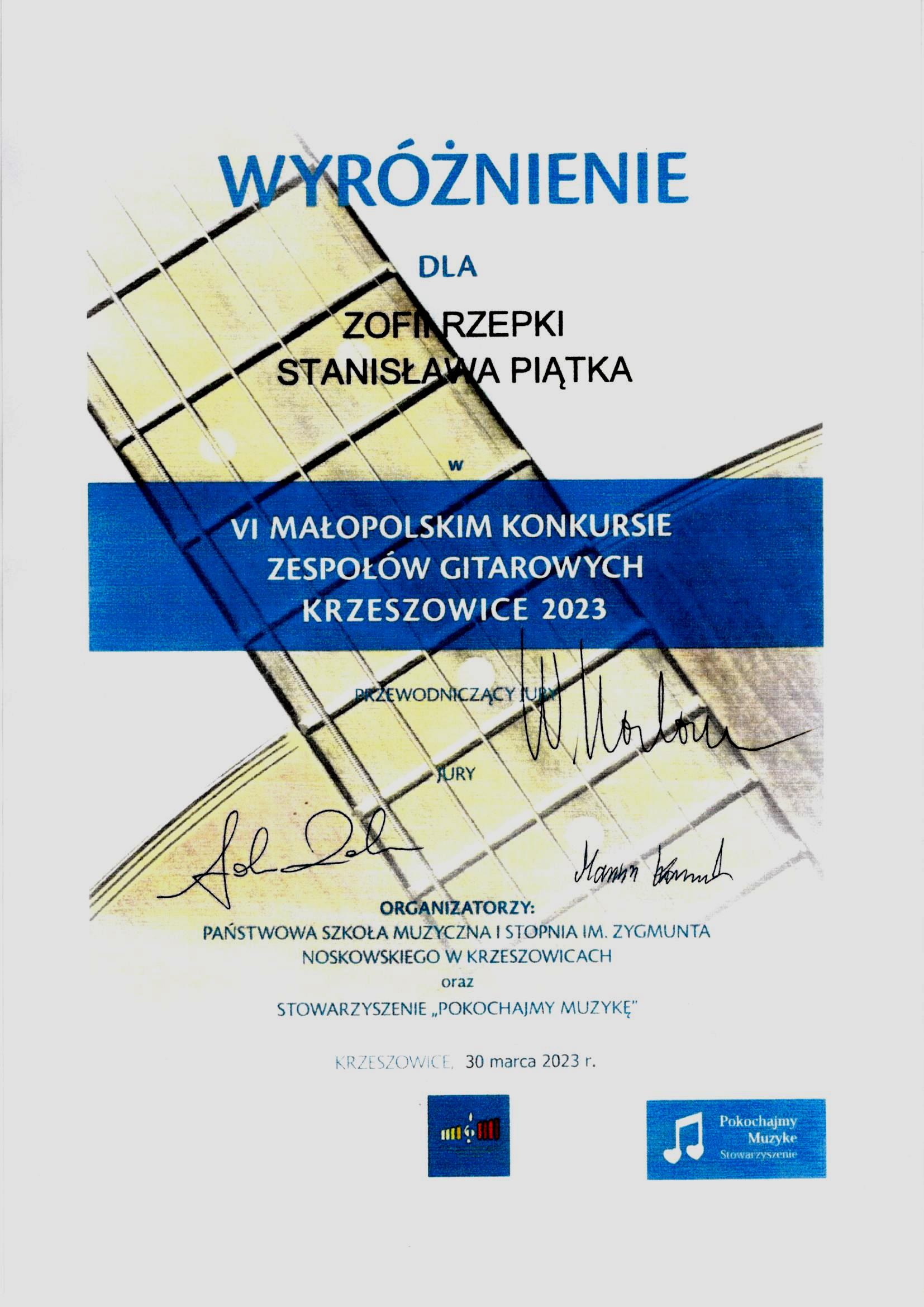 Wyróżnienie dla Zofii Rzepki i Stanisława Piątka z klasy gitary mgr Tadeusza Spyry w VI Małopolskim Konkursie Zespołów Gitarowych Krzeszowice 2023.Gratulujemy!!!