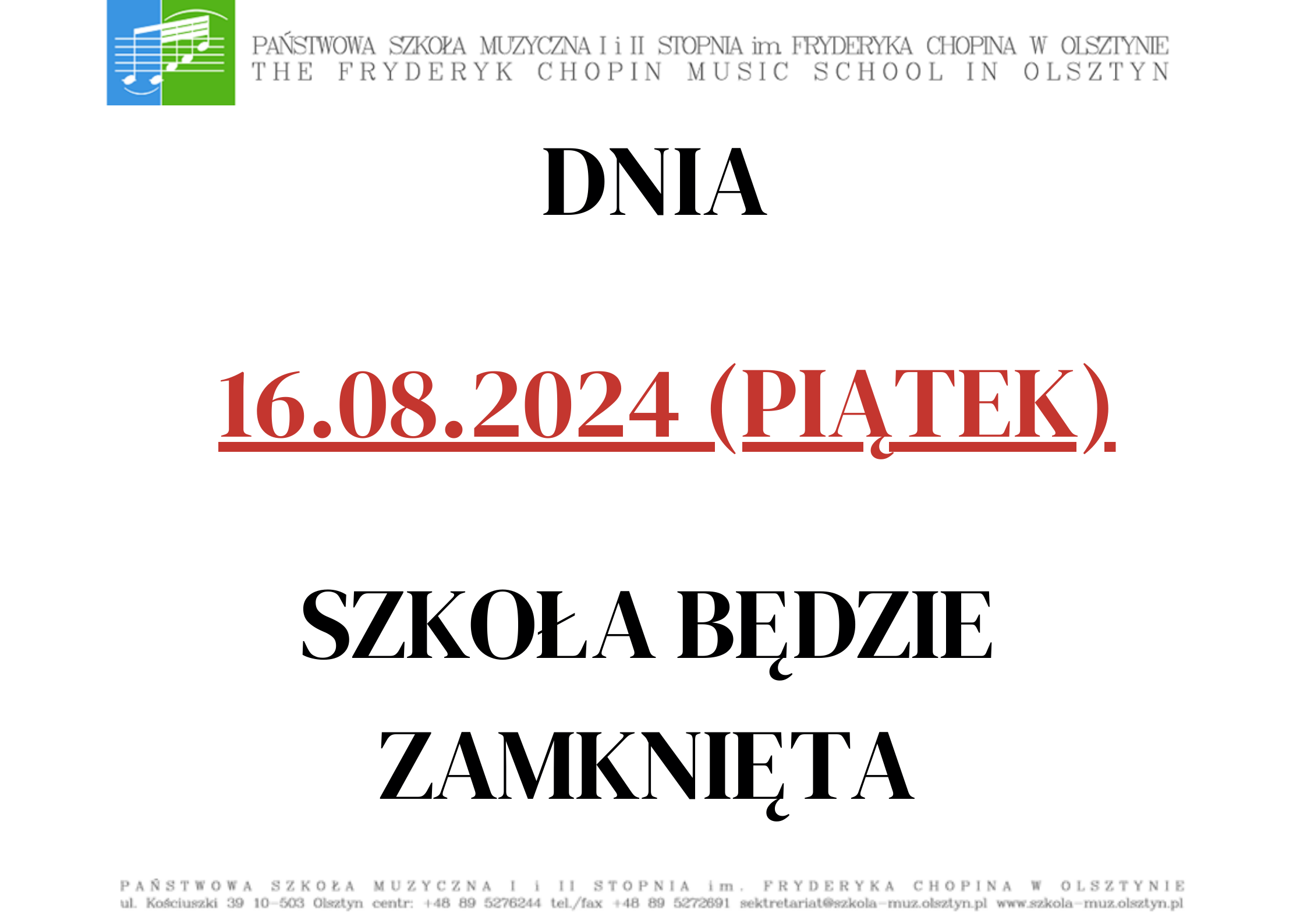 16.08.2024 - SZKOŁA BĘDZIE NIECZYNNA