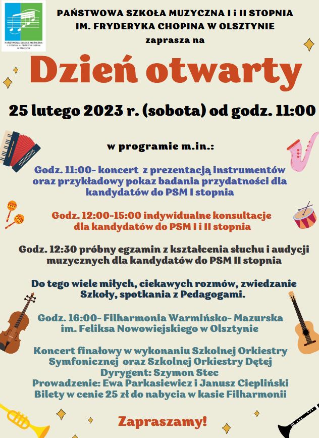 Godz. 16:00- Filharmonia Warmińsko-Mazurska im. Feliksa Nowowiejskiego w Olsztynie i koncert finałowy w wykonaniu Szkolnej Orkiestry Symfonicznej oraz Szkolnej Orkiestry Dętej