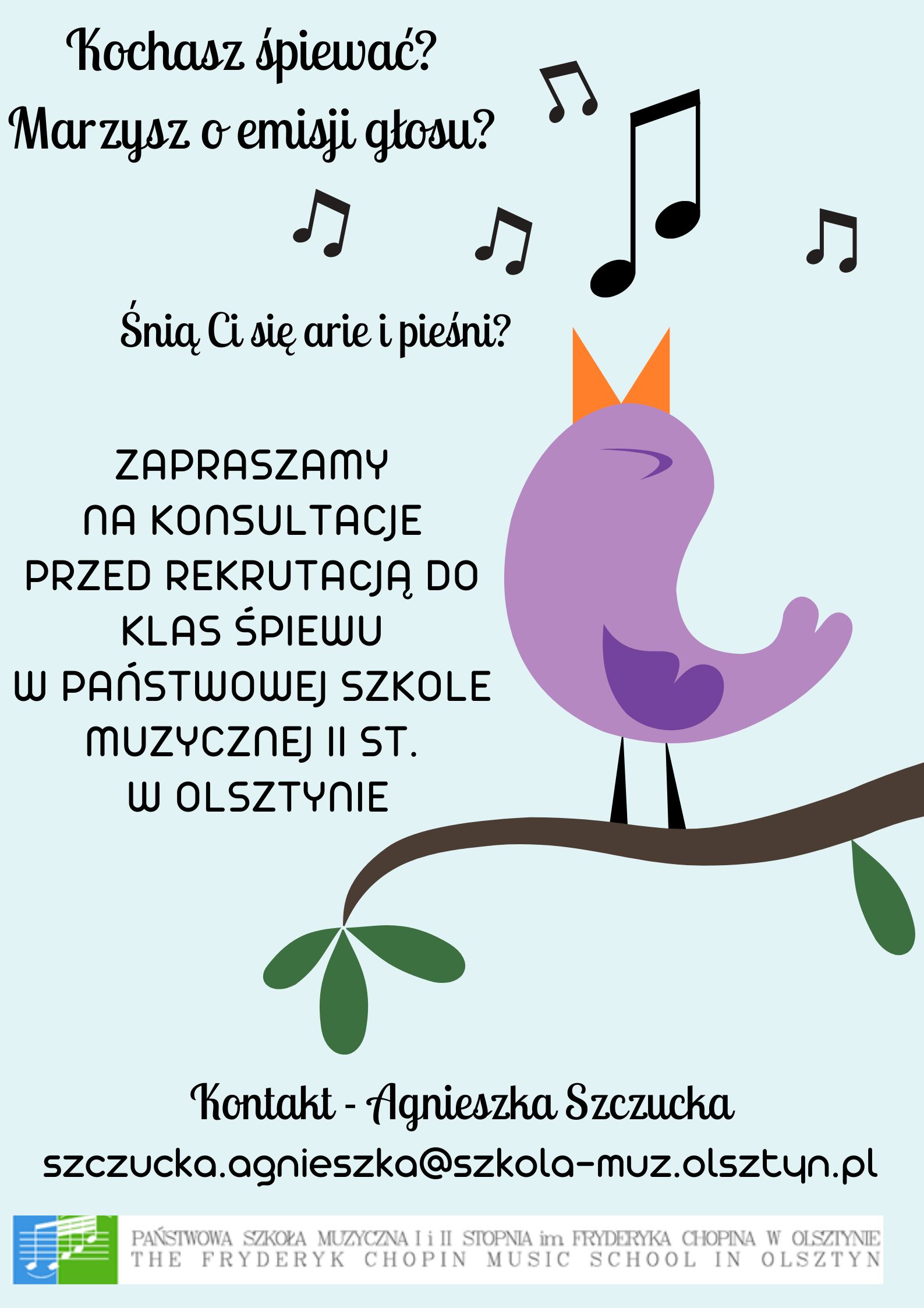 Zapraszamy kandydatów do szkoły muzycznej II stopnia na specjalność wokalistyka do korzystania z bezpłatnych konsultacji przygotowujących do egzaminu wstępnego z kształcenia słuchu i ogólnej wiedzy muzycznej.