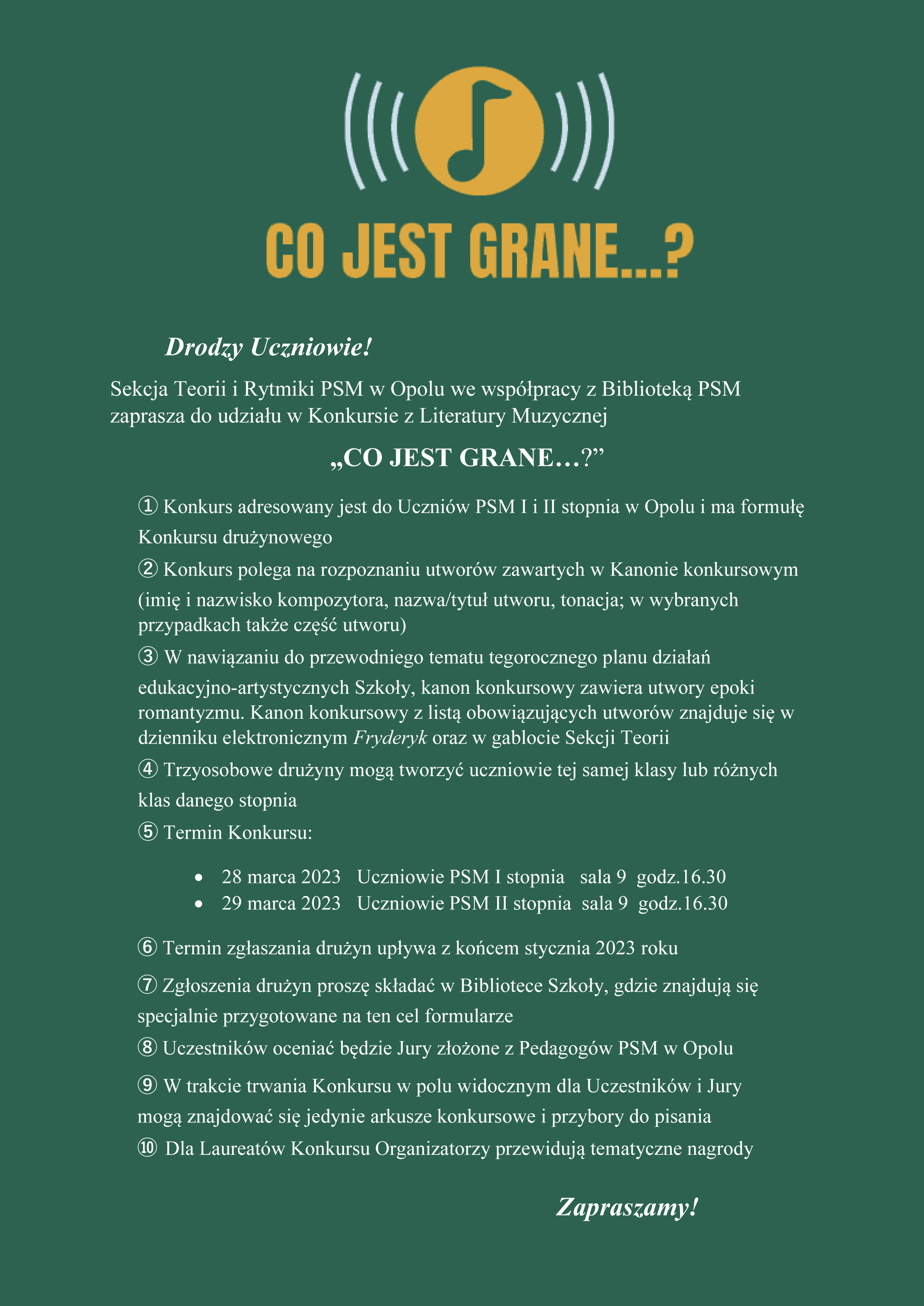Sekcja Teorii i Rytmiki PSM w Opolu we współpracy z Biblioteką PSM zaprasza do udziału w Konkursie z Literatury Muzycznej „CO JEST GRANE…?”
