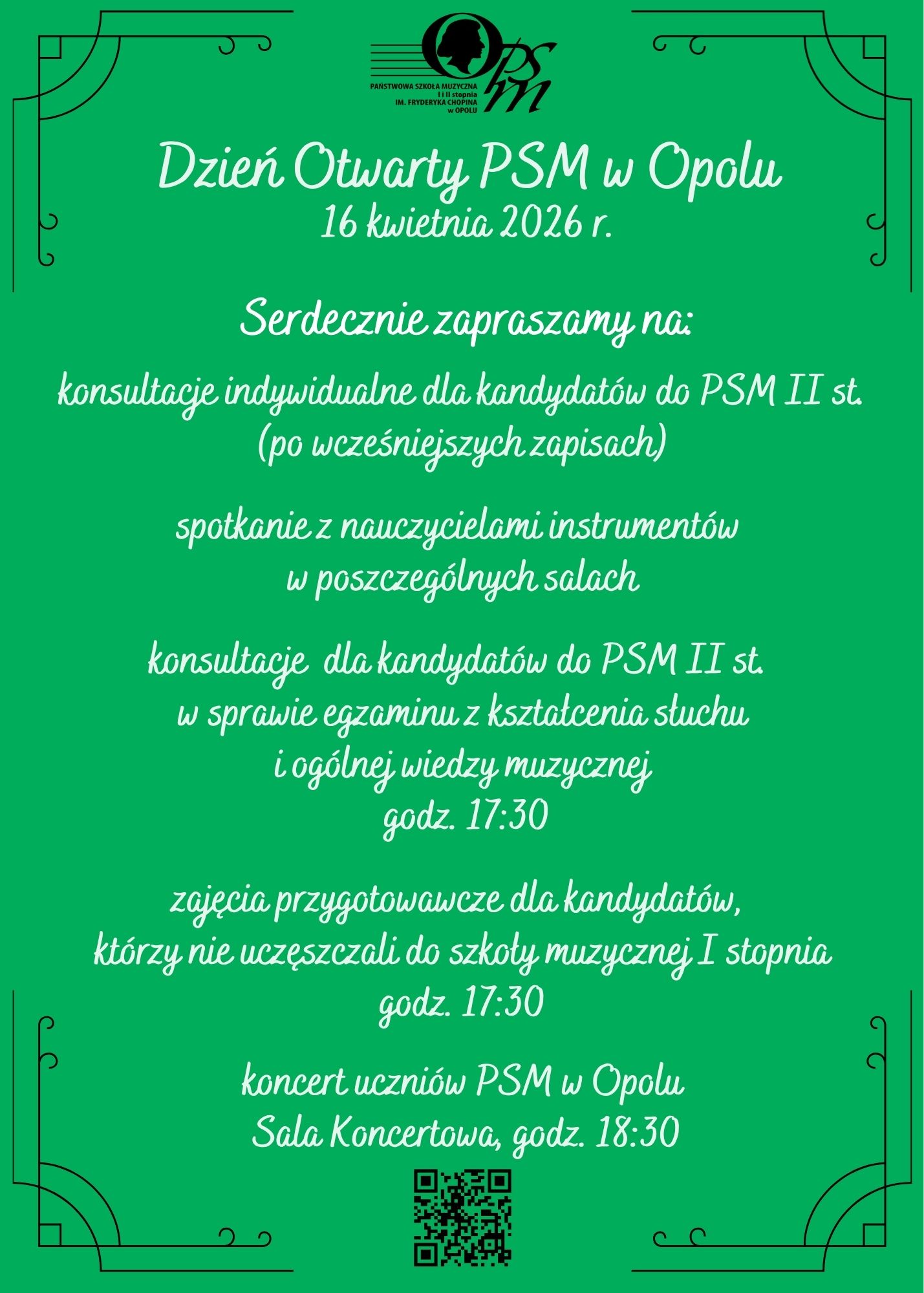 Serdecznie zapraszamy na Dzień Otwarty Państwowej Szkoły Muzycznej I i II stopnia im. Fryderyka Chopina w Opolu, w ramach którego odbędą się: