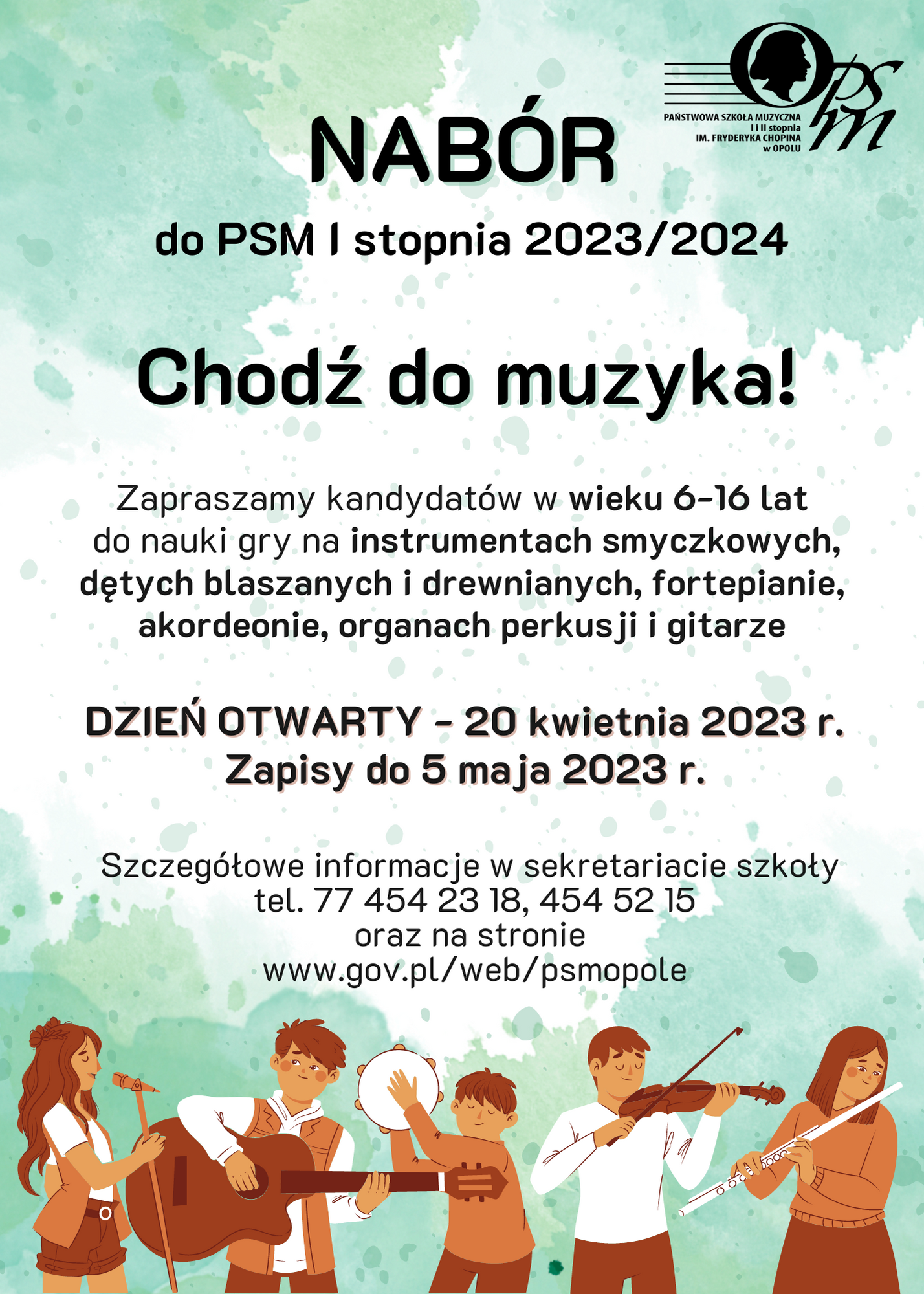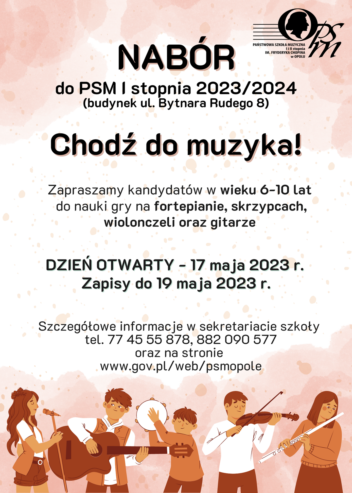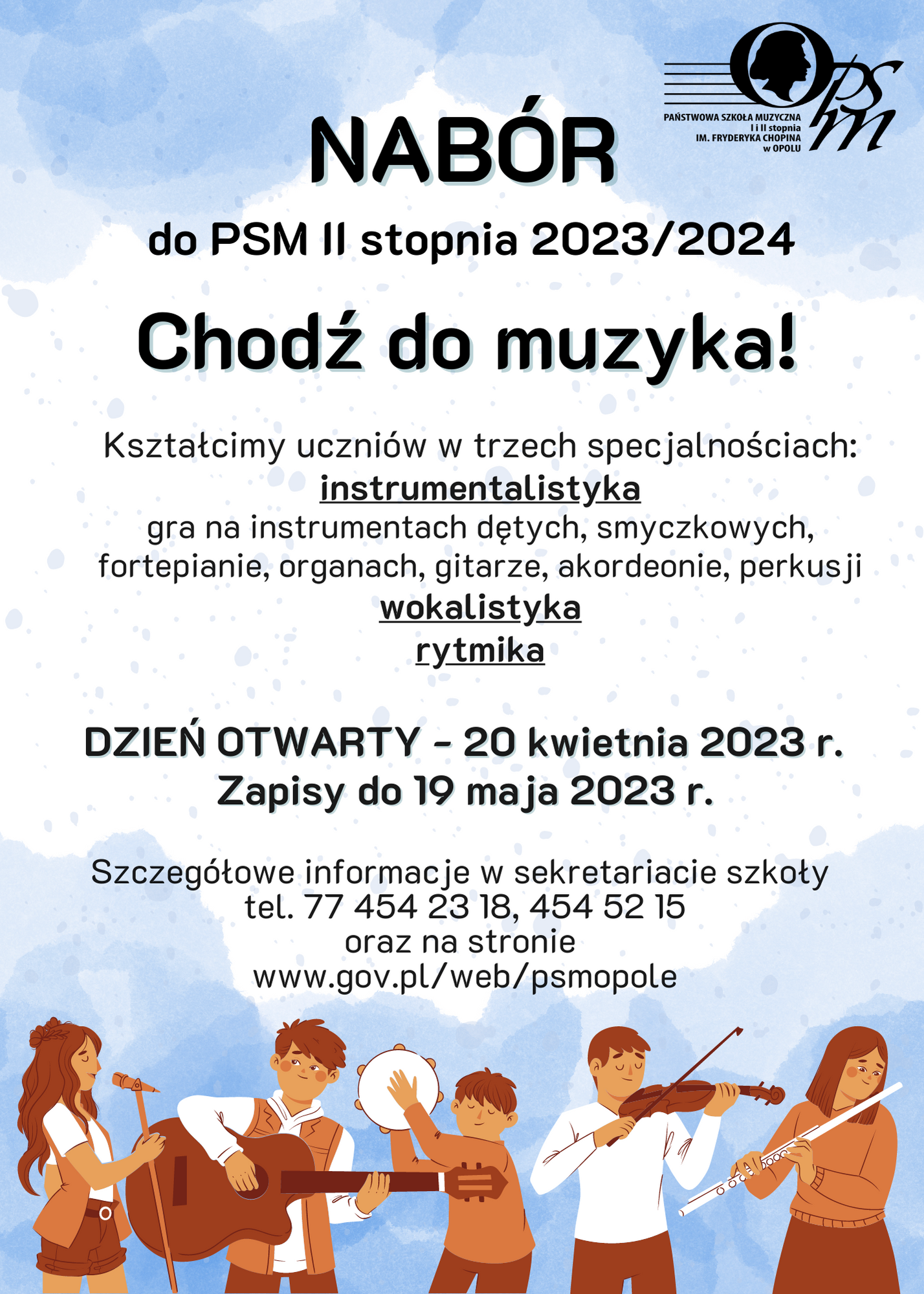 Wszystkich zainteresowanych nauką w Państwowej Szkole Muzycznej I i II stopnia im. Fryderyka Chopina w Opolu zapraszamy do zapoznania się z najważniejszymi informacjami o rekrutacji na rok szkolny 2023/2024.