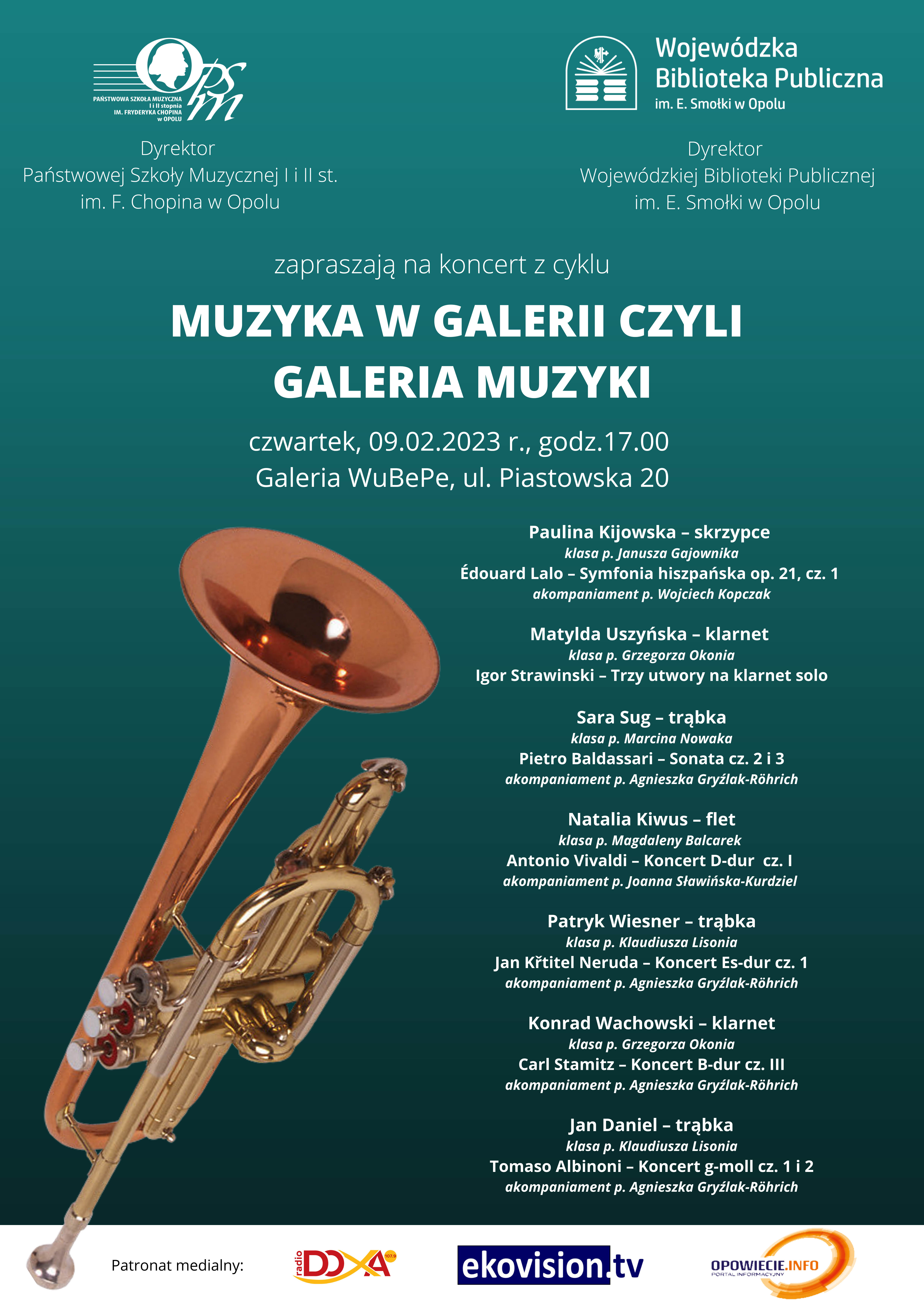 serdecznie zapraszamy na kolejny koncert z cyklu Muzyka w Gelerii czyli Galeria Muzyki, który odbędzie się w dniu 9 lutego 2023 r. /czwartek/, o godz. 17:00 w Galerii WuBePe przy ul. Piastowskiej 20 w Opolu.