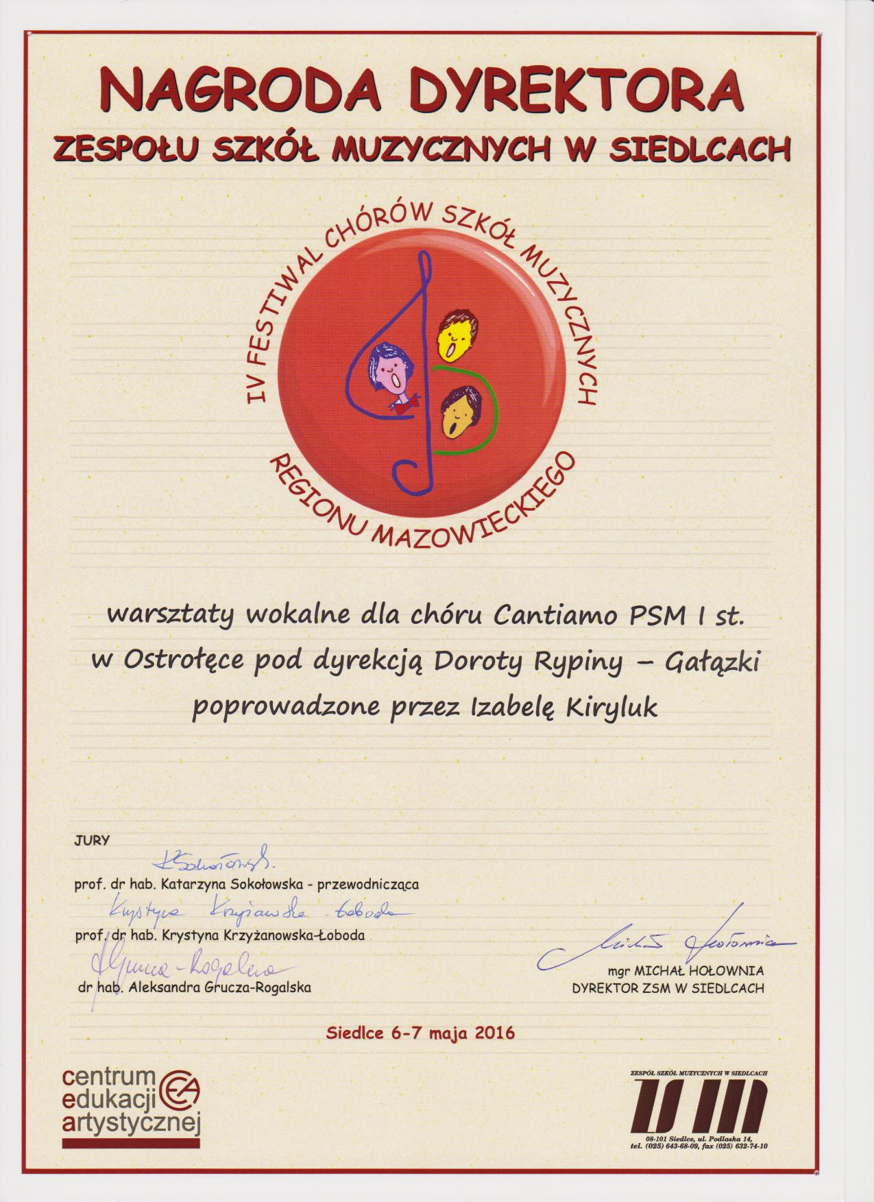 - Nagroda Dyrektora Zespołu Szkół Muzycznych w Siedlcach - Warsztaty wokalne dla chóru Cantiamo PSM I st. w Ostrołęce pod dyrekcją Doroty Rypiny - Gałązki prowadzonej przez Izabelę Kiryluk