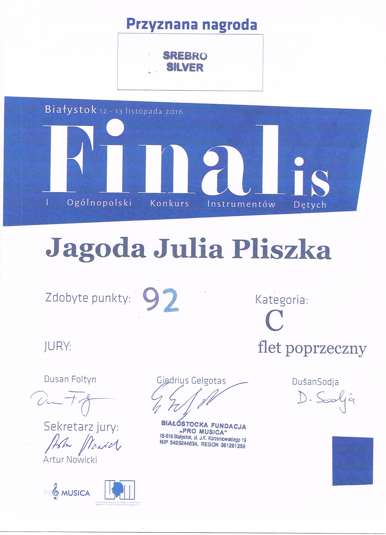 Jagoda Julia Pliszka z klasy fletu - nagroda SREBRO w kategorii C