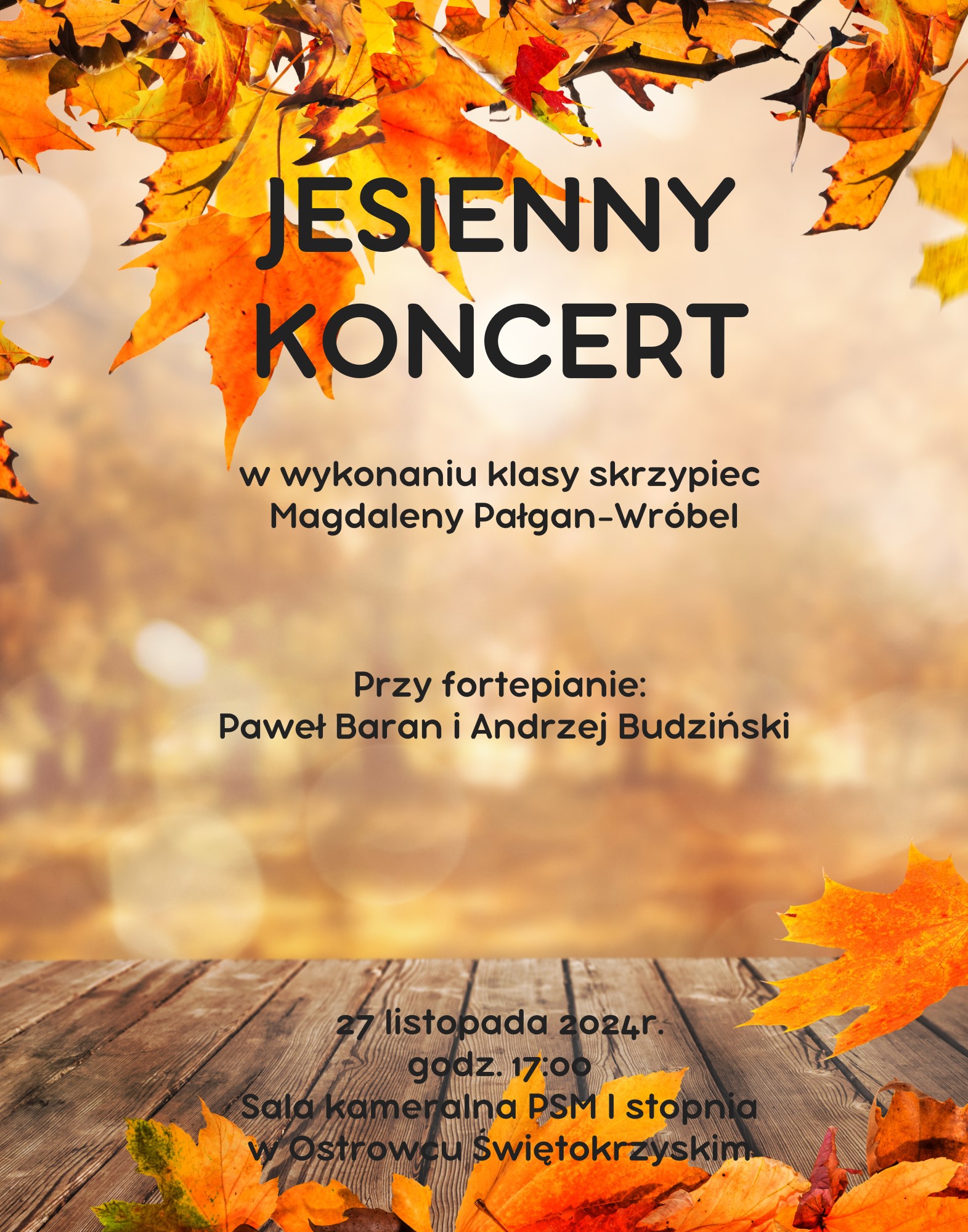 Grafika w barwach jesiennych. Górę i dół grafiki zajmują pomarańczowe liście klonu. Środkowa część w rozmytych barwach w odcieniu brązów i beży a na niej czarny napis informujący o wydarzeniu pn. " Jesienny koncert w wykonaniu klasy skrzypiec Magdaleny Pałgan - Wróbel"