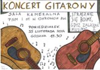 Grafika w orientacji poziomej stworzony przez ucznia klasy gitary Jakuba Głowackiego. Metoda tworzenia tradycyjna - flamastry. Tło białe. Po obu stronach plakatu fragmenty dwóch gitar akustycznych. Z lewej strony gitara chyli się ku dołowi. Z prawej gitara skierowana ku górze. U góry napis: Koncert klasy gitary, Sala kameralna PSM I st. w Ostrowcu Św. Po prawej stronie plakatu w ramce napis: Strasznie się boimy, gdyż zaliczać musimy I. W centralnym miejscu plakatu napis: Poniedziałek 25 listopada 2024 godz. 17.30.