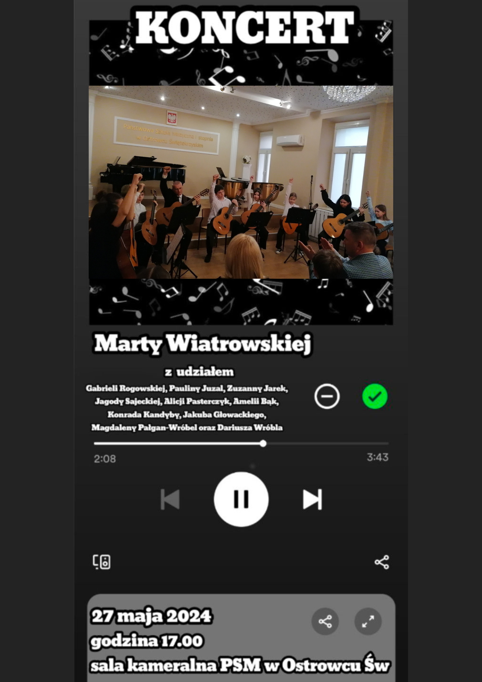 Grafika przedstawia zdjęcie zespołu gitarowego na sali kameralnej PSM I st. w Ostrowcu Św. Ciemne tło w odcieniach czerni, szarości. Białe napisy informacyjne o wydarzeniu pn. " Koncert Marty Wiatrowskiej"