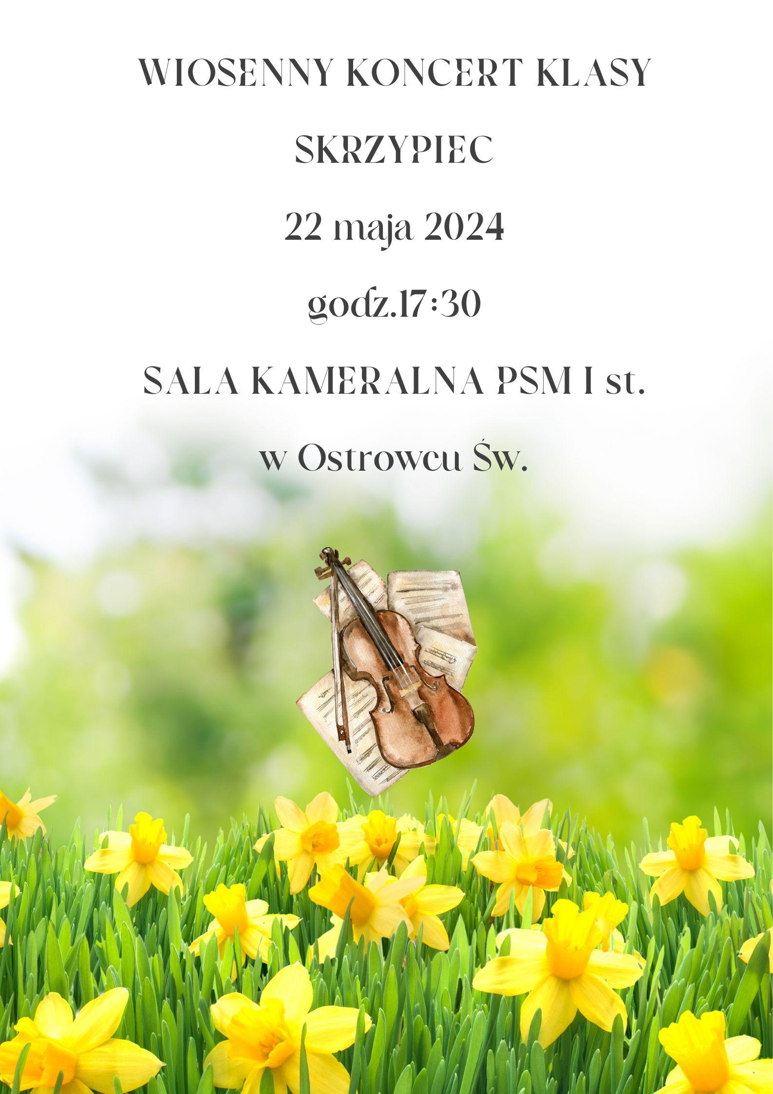 górna część grafiki w kolorze jasnym. W dolnej części żonkile rosnące w zielonej trawie. Po środku skrzypce oraz nuty. Czarne napisy informacyjne o wydarzeniu