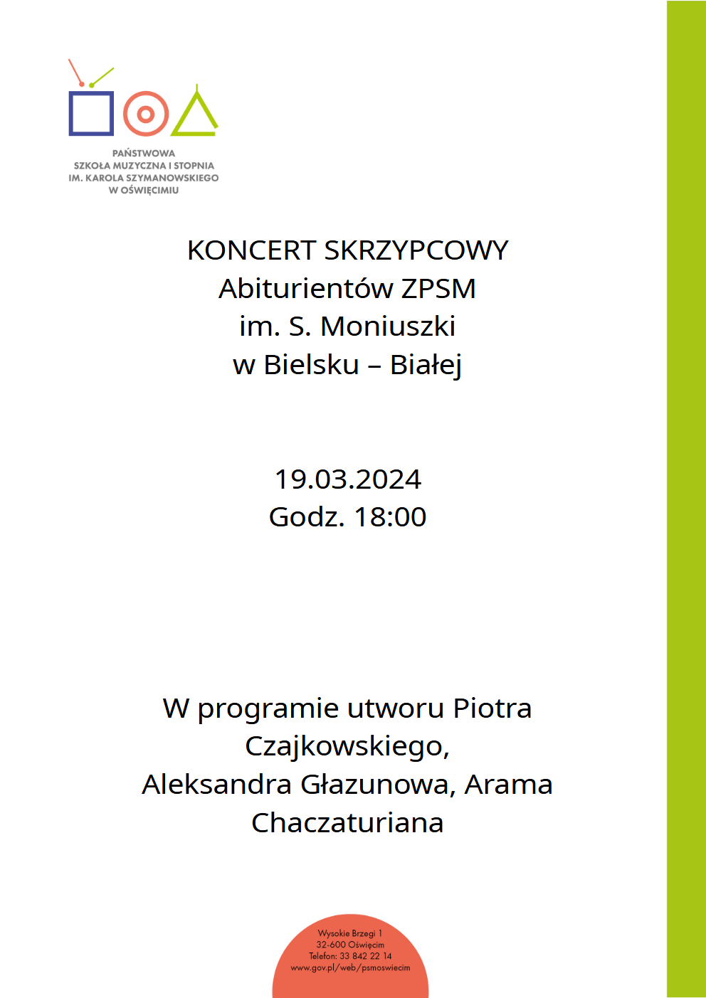 Zapraszamy na koncert skrzypcowy w wykonaniu abiturientów ZPSM im. S. Moniuszki w Bielsku-Białej. 19.03.2024, godz. 18:00, sala kameralna.