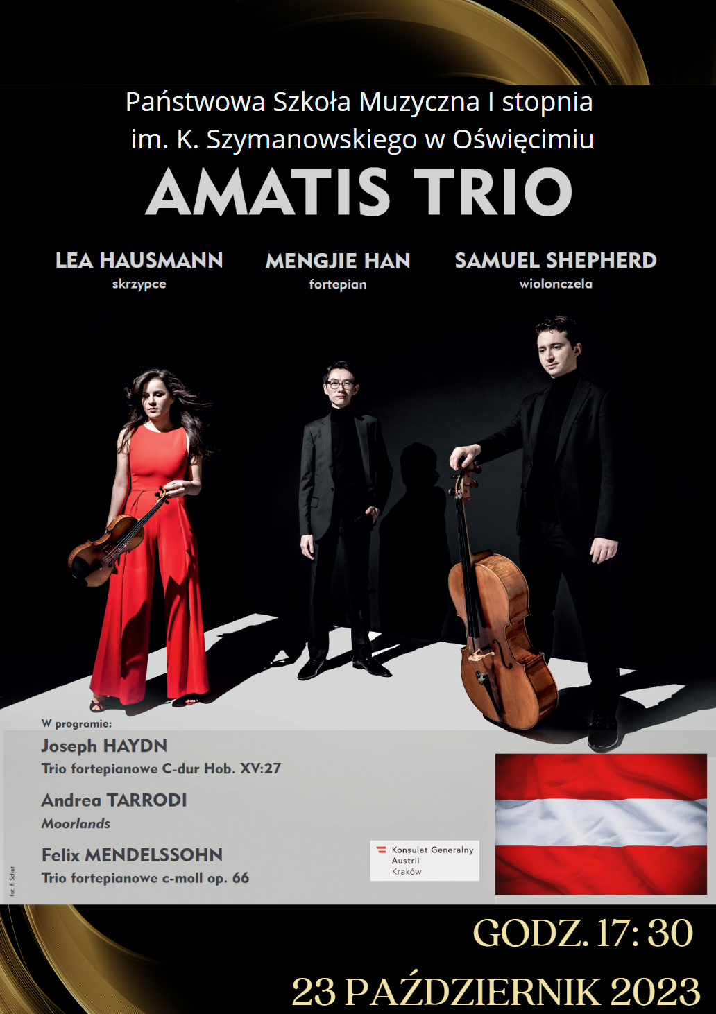 W poniedziałek 23 października o godzinie 17.30 w sali koncertowej odbędzie się koncert zespołu "Amatis Trio". Muzycy z Salzbourga wykonają utwory Haydna, Tarrodiego i Mendelssohna. Koncert organizowany jest we współpracy z Konsulatem Generalnym Austrii w Krakowie i Międzynarodowym Domem Spotkań Młodzieży. Serdeczenie zapraszamy, wstęp wolny.