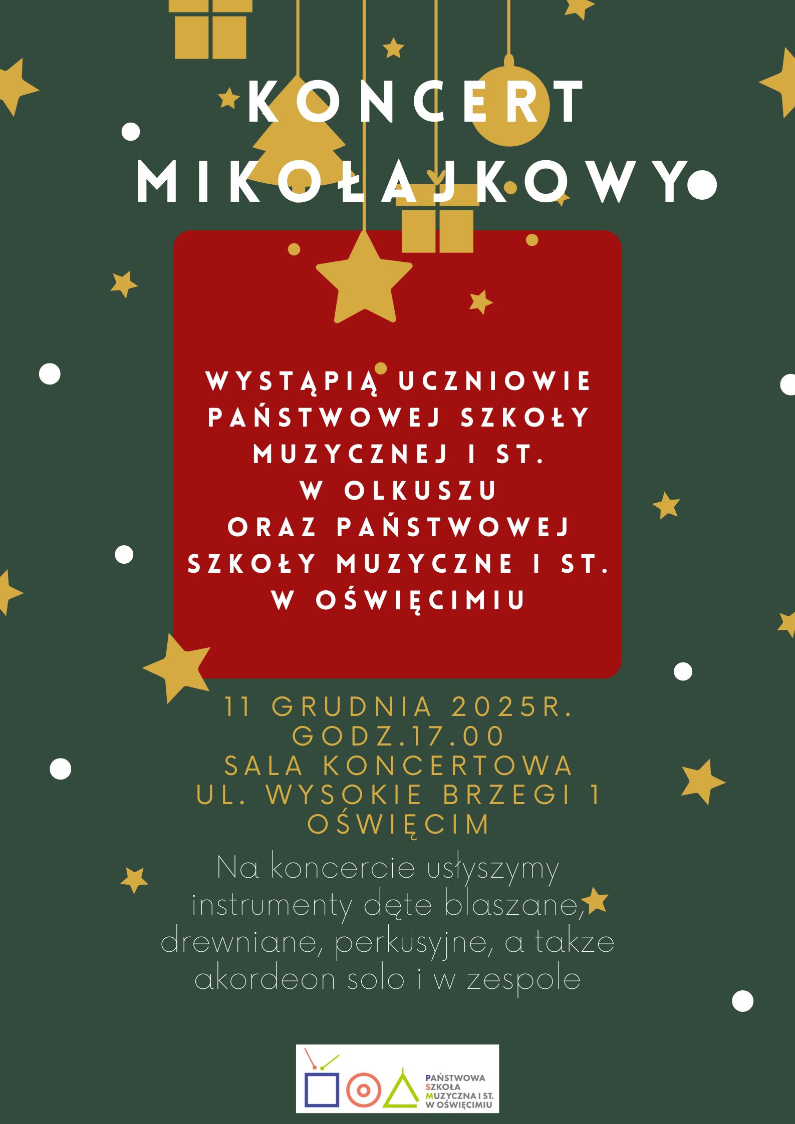 Sekcja Instrumentów Dętych, Akordeonu i Perkusji zaprasza społeczność naszej szkoły na "Koncert Mikołajkowy" w wykonaniu uczniów PSM I st w Olkuszu oraz PSM I st. w Oświęcimiu. Usłyszymy solistów i zespół o dość nietypowym składzie - nonet akordeonowy. 11 grudnia 2025 r. godz. 17:00, sala koncertowa. Przyjdź, bo warto!