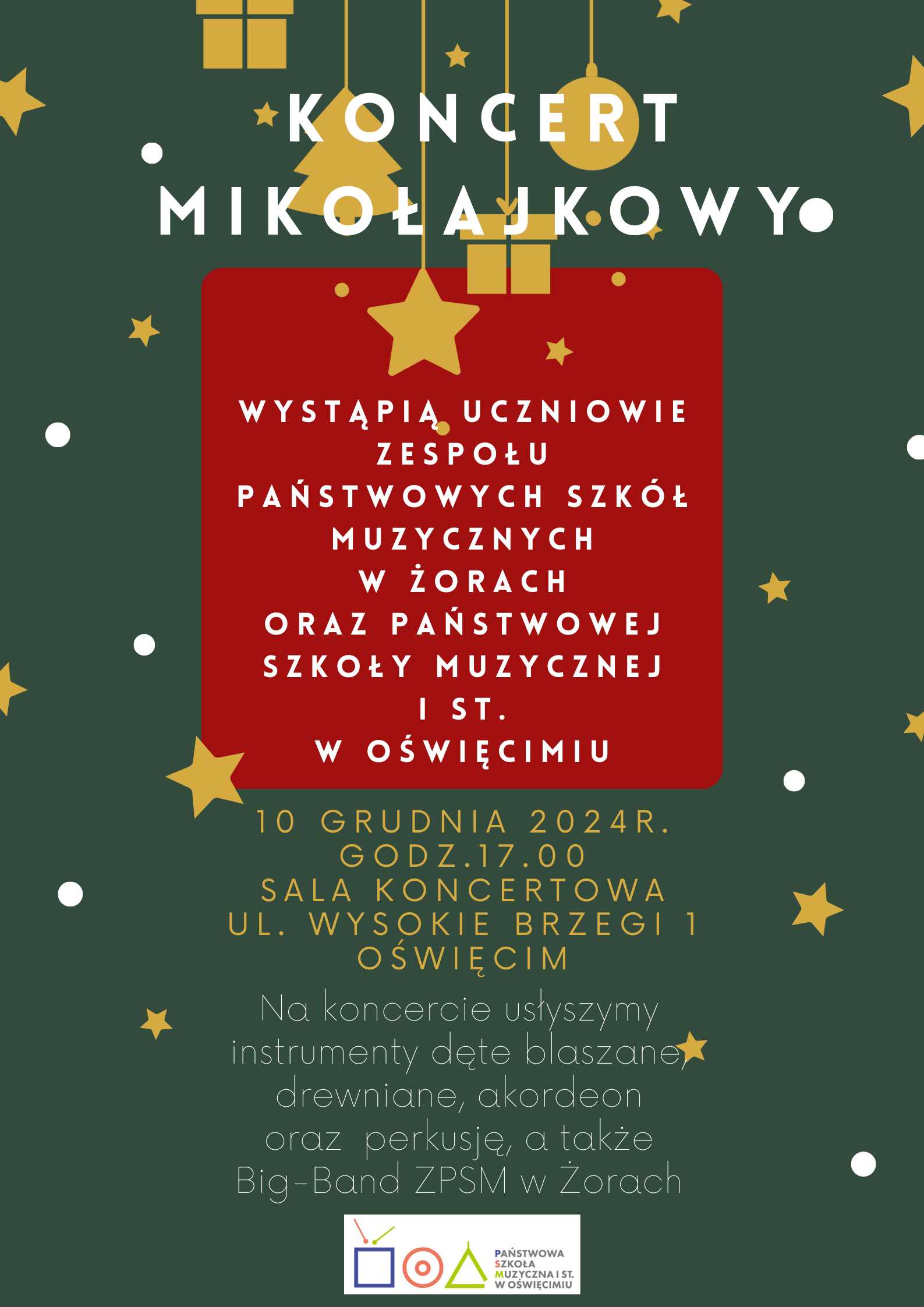Zapraszamy na "Koncert mikołajowy" w dniu 10 grudnia 2024 r. o godz: 17:00 w sali koncertowej PSM Oświęcim. Wystąpią uczniowie zespołu Państwowych Szkół Muzycznych w Żorach oraz Państwowej Szkoły Muzycznej I st. w Oświęcimiu. Na koncercie usłyszymy instrumenty dęte blaszane, drewniane, akordeon oraz perkusję, a także Big-Band ZPSM w Żorach.