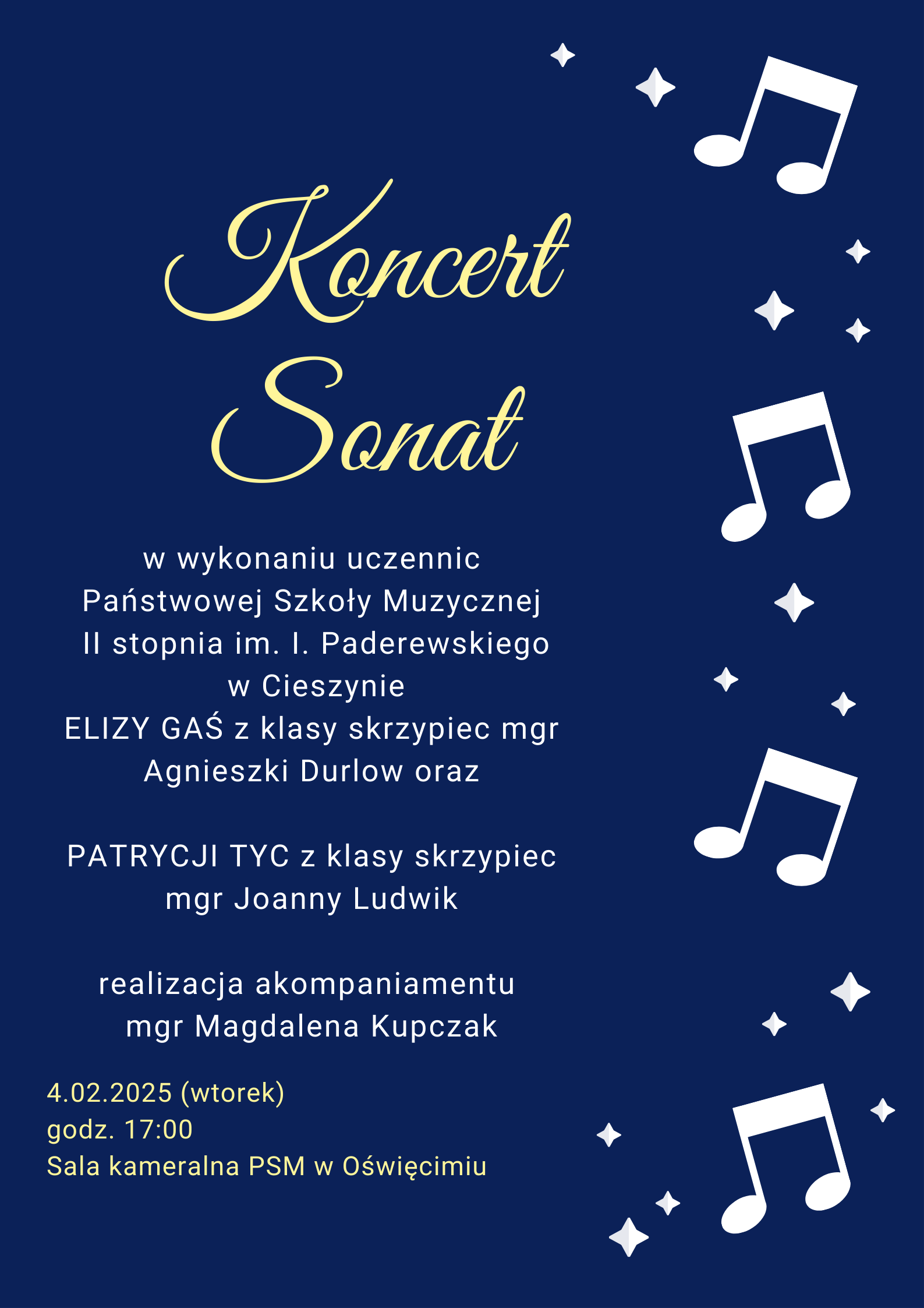 4 lutego 2025 w ramach współpracy sekcji instrumentów smyczkowych i gitary szkół muzycznych w Oświęcimiu i Cieszynie, będziemy mieli okazje wysłuchać recitalu dwóch skrzypaczek uczennic Państwowej Szkoły Muzycznej II stopnia im. I. Paderewskiego w Cieszynie.