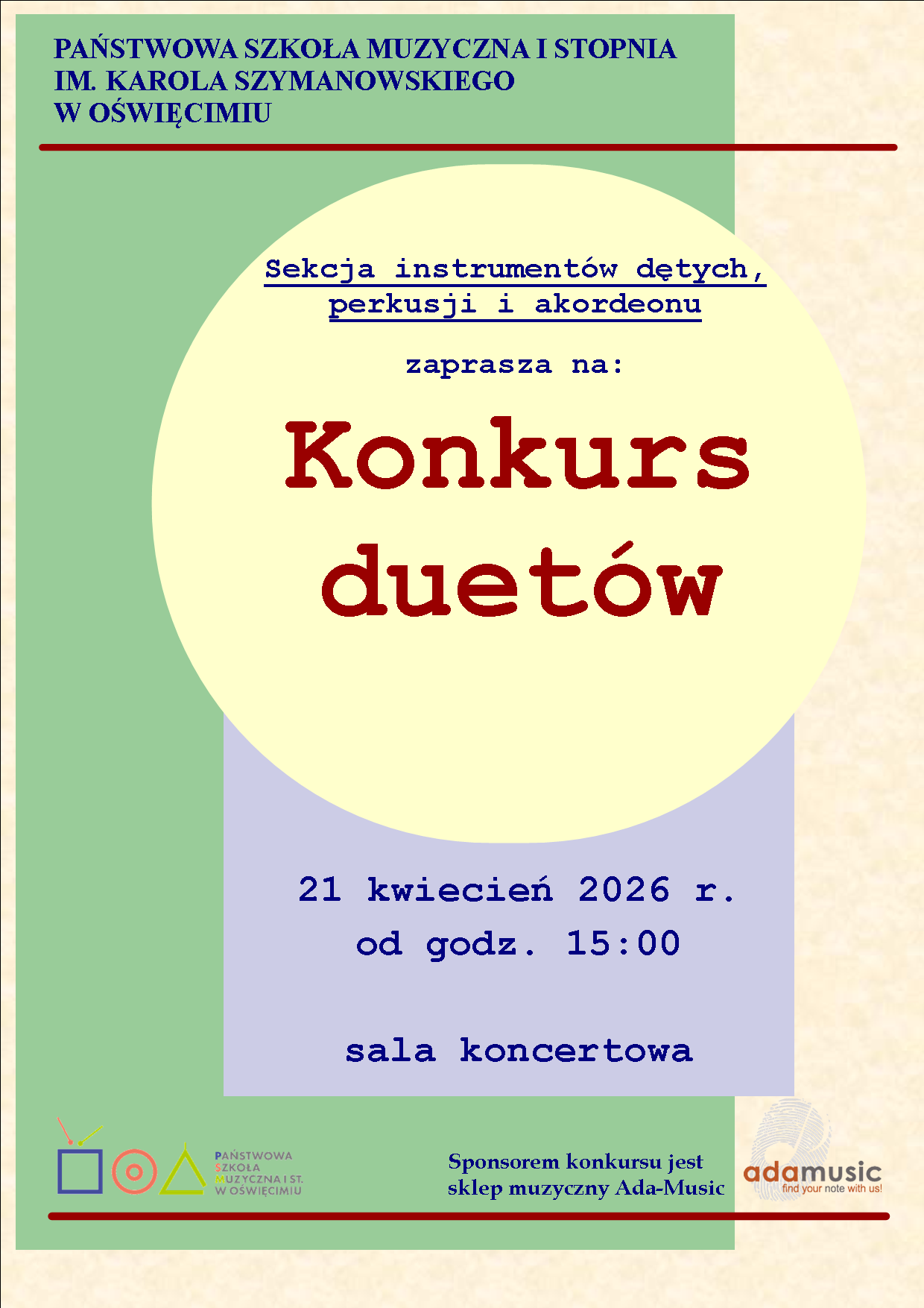 Serdecznie zapraszamy na Konkurs Sekcji Instrumentów Dętych, Perkusji i Akordeonu pod nazwą "Konkurs duetów", który odbędzie się w dniu 21 kwietnia 2026 r. w sali koncertowej PSM I st. w Oświęcimiu.