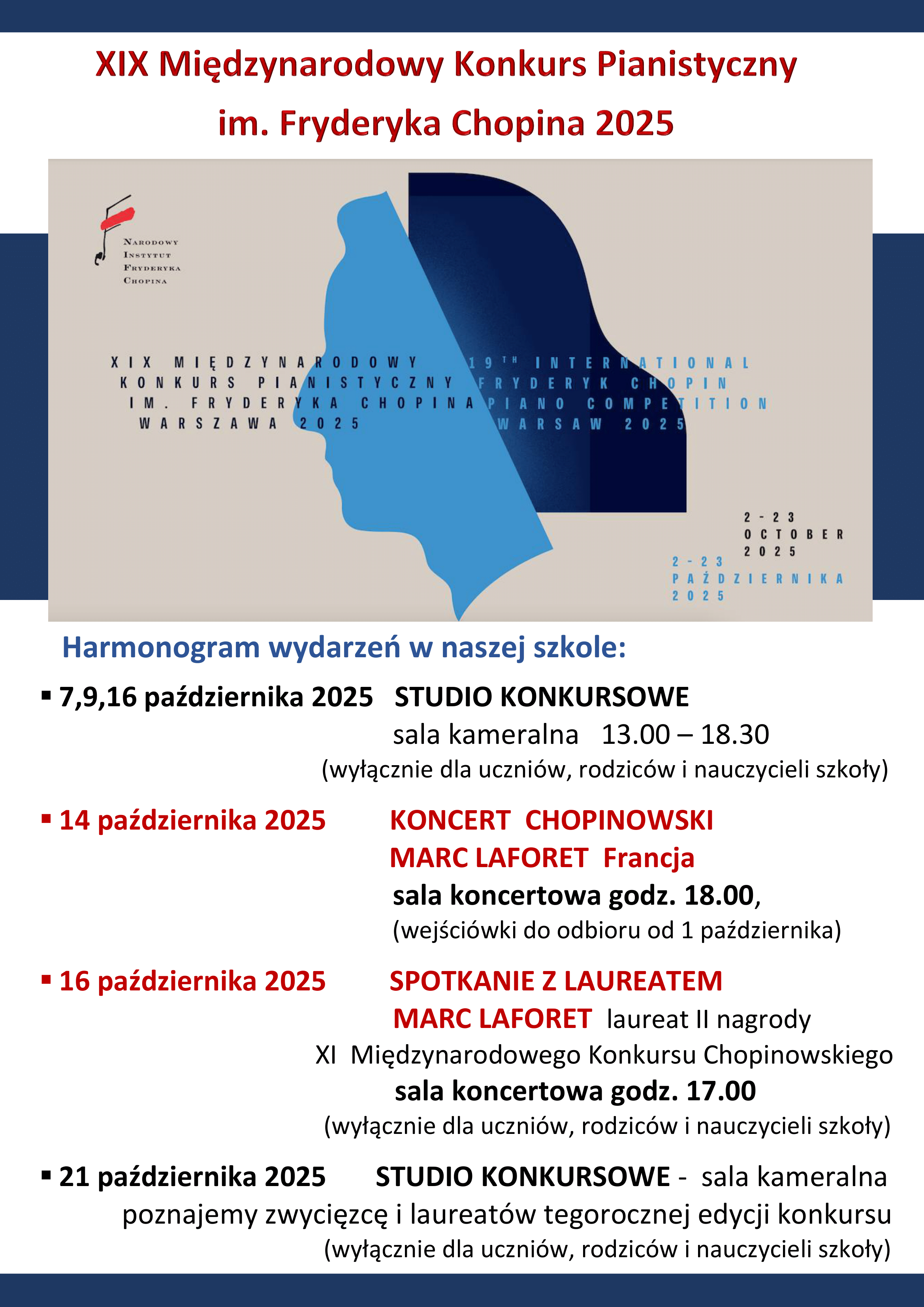 Serdecznie zapraszamy na XIX Międzynarodowy Konkus Pianistyczny im. Fryderyka Chopina który odbędzie się w dniach 2 - 23 października 2025 r. w Filharmonii Narodowej w Warszawie.
