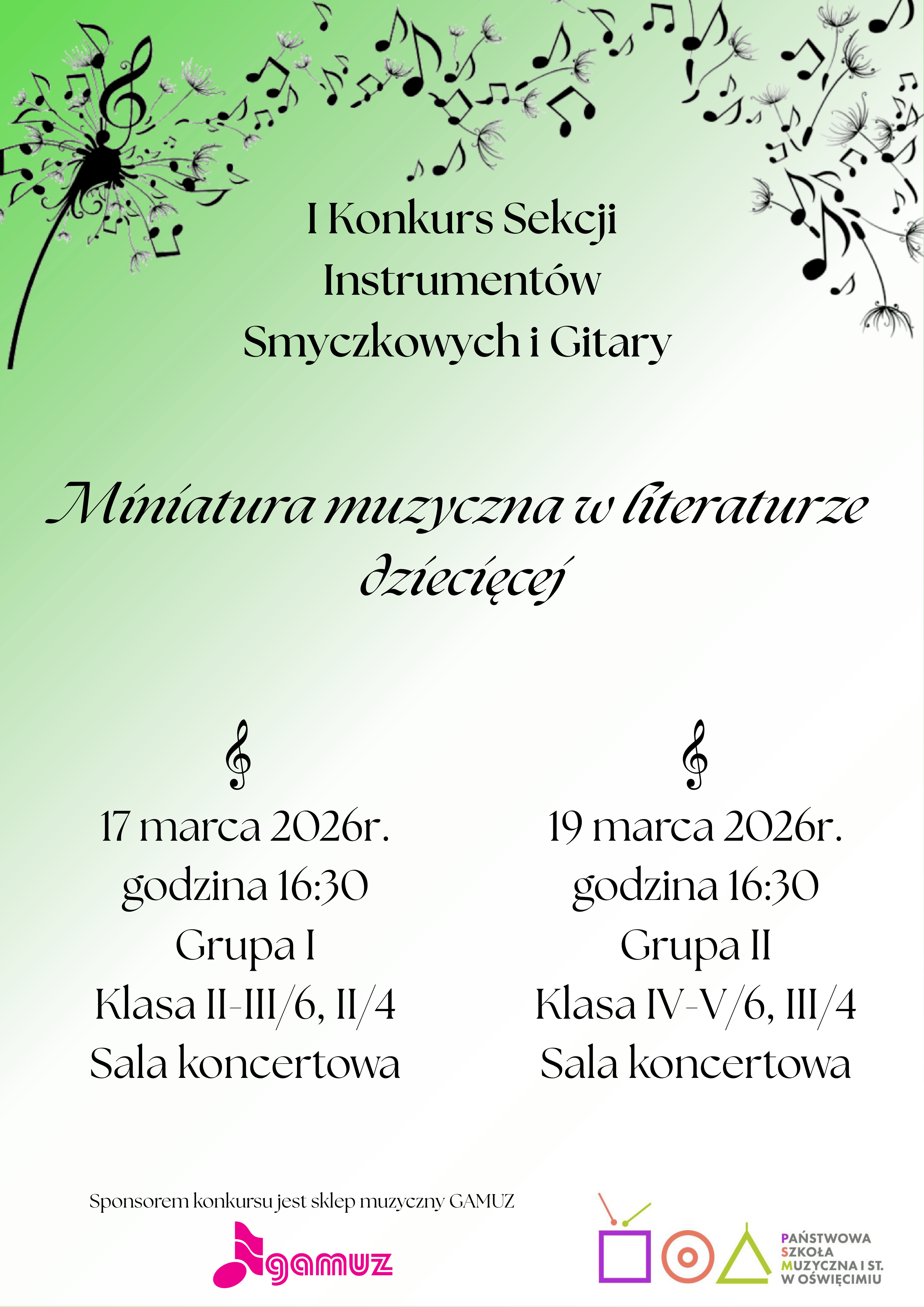Serdecznie zapraszamy na I Konkurs Sekcji Instrumentó Smyczkowych i Gitary pod nazwą "Miniatura muzyczna w literaturze dziecięcej", który odbędzie się w dniach 17 i 19 marca 2026 r. w sali koncertowej PSM I st. w Oświęcimiu.