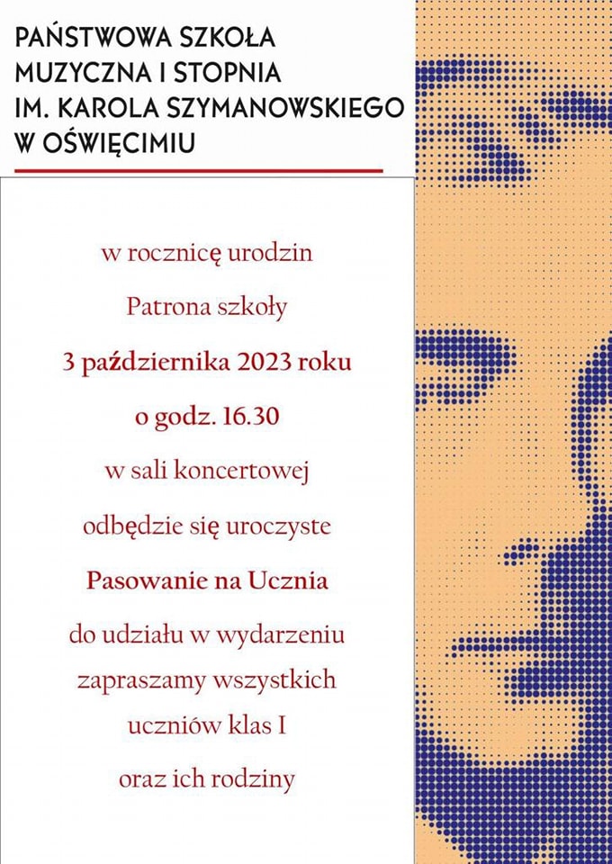 W rocznicę urodzin Patrona szkoły 3 października 2023 roku w sali koncertowej odbędzie się uroczyste pasowanie na ucznia. Do udziału w wydarzeniu zapraszamy wszystkich uczniów klas I oraz ich rodziny.